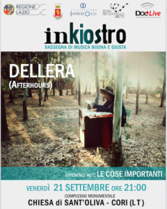 Venerdì 21 Settembre, alle ore 21:00, presso la Chiesa di Sant’Oliva a Cori, la stagione 2018 della Rassegna di Musica e Scrittura – InKIOSTRO continua con il concerto di Dellera al secolo Roberto Dell’Era. Ad aprire il suo live ci sarà la band di Latina Le Cose Importanti guidata da Giada Sagnelli. Prima e dopo l’azienda agricola “Le Quattro Vasche” e il Ristorante “Caffè del Cardinale” offriranno in degustazione i loro prodotti presso l’antistante Palazzetto Luciani. Dellera, attualmente impegnato nel suo “Stare bene è pericoloso Tour”, è autore, cantante e polistrumentista. Inglese d’adozione, respira per oltre 10 anni la scena musicale d’oltremanica ed internazionale. Ritornato in Italia nel 2006 diventa membro degli Afterhours, con i quali realizza tre tour americani, compone e registra l’album “I Milanesi ammazzano il Sabato” e vince al Festival di Sanremo il premio della critica nel 2008. Ha collaborato con Giovanni Gulino (Marta sui Tubi), Diego Mancino, Dente, Calibro35, Rodrigo d’Erasmo, Enzo Moretto (A Toys Orchestra), Gianluca de Rubertis (Il Genio). Due gli album da solista: “Colonna Sonora Originale” (2012) e “Stare bene è pericoloso” (2015), anticipato dal brano “Ogni cosa una volta”, contenuto nella colonna sonora del nuovo film di Pierfrancesco Favino, “Senza nessuna Pietà”. L’opening act della serata è affidato a “Le Cose Importanti”, progetto che nasce a Gennaio del 2017, imponendosi come massima esposizione del lavoro pregresso di Giada Sagnelli, fondatrice ed autrice. La band ha già all’attivo l’overture di Fabrizio Moro all’ultimo Lazio Pride tenutosi a Latina a Giugno 2017). Il 25 Marzo 2018 è stato presentato il video di “Torneremo a parlare di niente”, in concomitanza con l’uscita ufficiale del primo singolo. InKIOSTRO, iniziativa di Sofia Bucci, finanziata da DOC Live e Cori e Giulianello In Rete, col patrocinio di Regione Lazio e Comune di Cori, in 4 anni ha aperto le porte del Complesso Monumentale di Sant’Oliva (Cori), Villa Bernabei (Velletri) e Palazzo Salviati (Giulianello); ospitato artisti tra cui Cristiano Godano (Marlene Kuntz), Paolo Benvegnù, Daniele Celona, gaLoni, Emanuele Colandrea (Eva Mon Amour/Cappello a Cilindro), Pino Marino, Rival Karma (da UK), Valentina Lupi.
