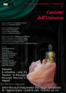 Sabato 06 ottobre alle ore 20.30 il palcoscenico del ‘Teatro Il Piccolo’ di Fuorigrotta in Piazzale Tecchio, a Napoli, sarà calcato dagli attori della Compagnia Imprevisti e Probabilità di Formia che presenteranno al pubblico lo spettacolo “Cantami dell’Universo” del regista Raffaele Furno. La serata è il Premio Finale della I° Rassegna di Teatro Amatoriale in TV “Proscenio – l’arte della commedia in TV – III Edizione” organizzata e ideata dall’Associazione Culturale Zerottantuno Arte e Cultura e dall’emittente televisiva regionale Quarto Canale Flegreo che ha trasmesso da Marzo a Maggio 2018 le diverse puntate che hanno visto come protagoniste diverse Compagnie provenienti da tutta la Regione. A trionfare è stata la Compagnia di Formia con lo spettacolo che il 06 Ottobre presenterà al pubblico napoletano. Lo spettacolo “Cantami dell’Universo” è tratto dalle Metamorfosi del poeta latino Ovidio ed oltre al Premio come Migliore Spettacolo ha portato a casa, nella Finale di Giugno scorso, i premi come Migliori Costumi a Anna Andreozzi, Miglior Attrice Non Protagonista a Gabriella Napolitano, Miglior Attore Protagonista a Ludovico Manna, Migliore Regia a Raffaele Furno e il Premio Giovani di Quarto. Il Premio Finale consiste appunto nella rappresentazione di un proprio spettacolo al Teatro Il Piccolo di Napoli, premio offerto dagli organizzatori Zerottantuno Arte e Cultura e Quarto Canale Flegreo. Giunto alla III Edizione (si sta già programmando la IV), “Proscenio – l’arte della commedia in TV” è il primo format regolarmente registrato alla SIAE che mira a far conoscere le Compagnie Amatoriali attraverso il veicolo comunicativo a più ampio raggio: la televisione. In sinergia con Quarto Canale Flegreo (canale 648 del Digitale Terrestre) l’Associazione Culturale nonché Compagnia Teatrale Zerottantuno Arte e Cultura organizza la Rassegna rivolta a tutte le Compagnie Amatoriali della Regione che possono partecipare con un loro spettacolo. Ad ogni Compagnia è dedicata una puntata della durata di 40 minuti circa, in onda ogni Giovedì sera alle 21: all’interno della trasmissione una delegazione della Compagnia presente in Studio racconta la propria attività teatrale e qualche aneddoto sulla messa in scena dello spettacolo. “Proscenio – l’arte della commedia in TV” vuole essere però anche una trasmissione sul teatro a 360°: in ogni puntata vengono proposte anche rubriche di Storia del Teatro – che ha come tema lo spettacolo proposto dalla Compagnia e il suo Autore – e interviste agli esperti del settore come registi, attori professionisti, costumisti, ecc ecc. Tra gli ospiti: Nando Paone, Michele Caputo, Costantino Punzo, Massimo Masiello, Peppe Celentano. La conduzione è affidata a Rita Di Grazia, volto storico dell’emittente flegrea, mentre l’area redazionale e giornalistica in video è curata da Francesco Pace, inviato in esterna. La giuria è composta da esperti del settore: Guglielmo Marino, Rosa De Luca, Flavia Balsamo, Gabriella Tartarone, Giovanni De Luise, Melissa De Vincenzo; accanto alla Giuria Tecnica è presente anche la Giuria Giovani di Quarto, studenti dell’ISIS Rita Levi Montalcini: Francesco Pio De Fenza, Ilaria Maria Di Vicino, Flora Dellini, Teresa Braccioforte, Antonio Rota. Appuntamento sabato 6 ottobre alle 20.30 al Teatro Il Piccolo di Fuorigrotta dunque con “Cantami dell’Universo”, drammaturgia e regia di Raffaele Furno, della Compagnia Imprevisti e Probabilità di Formia, vincitrice della III Edizione di “Proscenio – l’arte della commedia in TV”.