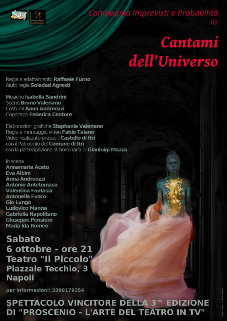 Sabato 06 ottobre alle ore 20.30 il palcoscenico del ‘Teatro Il Piccolo’ di Fuorigrotta in Piazzale Tecchio, a Napoli, sarà calcato dagli attori della Compagnia Imprevisti e Probabilità di Formia che presenteranno al pubblico lo spettacolo “Cantami dell’Universo” del regista Raffaele Furno. La serata è il Premio Finale della I° Rassegna di Teatro Amatoriale in TV “Proscenio – l’arte della commedia in TV – III Edizione” organizzata e ideata dall’Associazione Culturale Zerottantuno Arte e Cultura e dall’emittente televisiva regionale Quarto Canale Flegreo che ha trasmesso da Marzo a Maggio 2018 le diverse puntate che hanno visto come protagoniste diverse Compagnie provenienti da tutta la Regione. A trionfare è stata la Compagnia di Formia con lo spettacolo che il 06 Ottobre presenterà al pubblico napoletano. Lo spettacolo “Cantami dell’Universo” è tratto dalle Metamorfosi del poeta latino Ovidio ed oltre al Premio come Migliore Spettacolo ha portato a casa, nella Finale di Giugno scorso, i premi come Migliori Costumi a Anna Andreozzi, Miglior Attrice Non Protagonista a Gabriella Napolitano, Miglior Attore Protagonista a Ludovico Manna, Migliore Regia a Raffaele Furno e il Premio Giovani di Quarto. Il Premio Finale consiste appunto nella rappresentazione di un proprio spettacolo al Teatro Il Piccolo di Napoli, premio offerto dagli organizzatori Zerottantuno Arte e Cultura e Quarto Canale Flegreo. Giunto alla III Edizione (si sta già programmando la IV), “Proscenio – l’arte della commedia in TV” è il primo format regolarmente registrato alla SIAE che mira a far conoscere le Compagnie Amatoriali attraverso il veicolo comunicativo a più ampio raggio: la televisione. In sinergia con Quarto Canale Flegreo (canale 648 del Digitale Terrestre) l’Associazione Culturale nonché Compagnia Teatrale Zerottantuno Arte e Cultura organizza la Rassegna rivolta a tutte le Compagnie Amatoriali della Regione che possono partecipare con un loro spettacolo. Ad ogni Compagnia è dedicata una puntata della durata di 40 minuti circa, in onda ogni Giovedì sera alle 21: all’interno della trasmissione una delegazione della Compagnia presente in Studio racconta la propria attività teatrale e qualche aneddoto sulla messa in scena dello spettacolo. “Proscenio – l’arte della commedia in TV” vuole essere però anche una trasmissione sul teatro a 360°: in ogni puntata vengono proposte anche rubriche di Storia del Teatro – che ha come tema lo spettacolo proposto dalla Compagnia e il suo Autore – e interviste agli esperti del settore come registi, attori professionisti, costumisti, ecc ecc. Tra gli ospiti: Nando Paone, Michele Caputo, Costantino Punzo, Massimo Masiello, Peppe Celentano. La conduzione è affidata a Rita Di Grazia, volto storico dell’emittente flegrea, mentre l’area redazionale e giornalistica in video è curata da Francesco Pace, inviato in esterna. La giuria è composta da esperti del settore: Guglielmo Marino, Rosa De Luca, Flavia Balsamo, Gabriella Tartarone, Giovanni De Luise, Melissa De Vincenzo; accanto alla Giuria Tecnica è presente anche la Giuria Giovani di Quarto, studenti dell’ISIS Rita Levi Montalcini: Francesco Pio De Fenza, Ilaria Maria Di Vicino, Flora Dellini, Teresa Braccioforte, Antonio Rota. Appuntamento sabato 6 ottobre alle 20.30 al Teatro Il Piccolo di Fuorigrotta dunque con “Cantami dell’Universo”, drammaturgia e regia di Raffaele Furno, della Compagnia Imprevisti e Probabilità di Formia, vincitrice della III Edizione di “Proscenio – l’arte della commedia in TV”.
