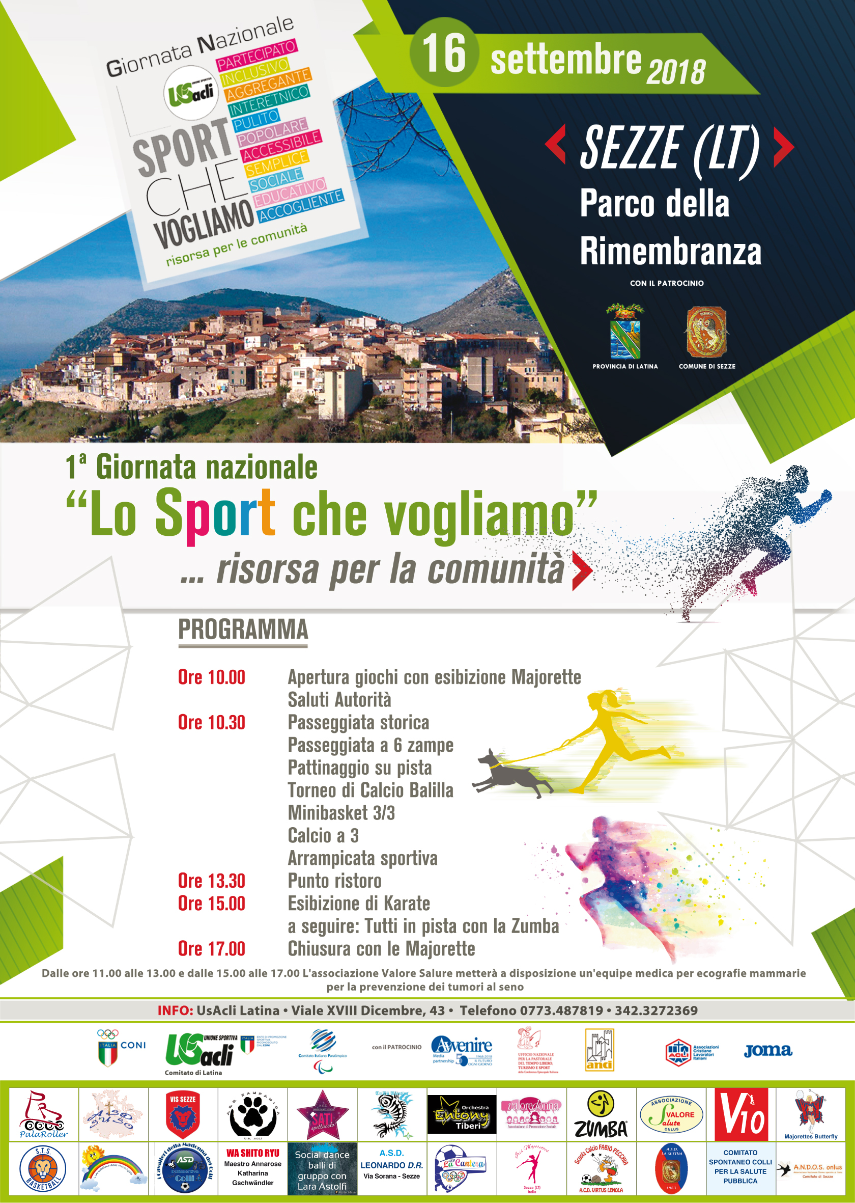 Domenica 16 settembre 2018 si svolgerà a Sezze, presso il Parco della Rimembranza, la 1a Giornata nazionale dell’Unione Sportiva ACLI: “Lo Sport che vogliamo” – Risorsa per la comunità”. E’ un evento promosso dall’US Acli, in contemporanea su tutto il territorio nazionale, per promuovere la diffusione della pratica sportiva come strumento di benessere, inclusione e riscatto sociale e per mettere in luce tutte quelle potenzialità dello sport capaci di far crescere culturalmente e socialmente il territorio, favorendone un ruolo attivo e riconosciuto nelle politiche di sviluppo. Per questo l’iniziativa ha ottenuto il patrocinio dell’ANCI (Associazione Nazionale Comuni d’Italia), dell’Ufficio Nazionale per la Pastorale del Tempo libero, turismo e sport della CEI e del quotidiano Avvenire. Sezze sarà una delle 38 piazze italiane in cui si svolgerà l’iniziativa. “Abbiamo scelto Sezze” – dice il Presidente provinciale US Acli di Latina, Anna Maria Tufano -“perché abbiamo trovato nel Sindaco, Sergio di Raimo e nell’Assessore allo Sport Paola Di Veroli, persone con i nostri stessi obiettivi e particolarmente sensibili al benessere dei propri cittadini”. “Il programma della Giornata” – continua Tufano – “è ricco di attività sportive aperte a tutti, grazie alla collaborazione delle tante associazioni che si sono impegnate per la riuscita della manifestazione”. Ci saranno esibizioni di basket, pattinaggio, mini calcio, arrampicata sportiva, karate, danza sportiva, mini torneo di calcio balilla e punti informativi sulle attività promosse dall’US Acli sul territorio. Inoltre verranno realizzate iniziative sul tema della prevenzione e del benessere. Grazie all’associazione Valore Salute, un’equipe di medici sarà presente in piazza offrendo l’opportunità di esami diagnostici (ecografia mammaria) per la prevenzione del tumore al seno. Sarà poi organizzata la “Passeggiata a 6 zampe” per sensibilizzare la comunità ad un corretto rapporto tra uomo e cane. Da non dimenticare, una camminata tra i vicoli storici del paese con l’aiuto di una guida locale che spiegherà le bellezze delle famose cimase. Per l’occasione il Comune ha offerto la possibilità di visitare il Museo archeologico, la casa di San Carlo, la Chiesa di San Lorenzo e la Cattedrale di Santa Maria. In ultimo si potrà godere della suggestiva panoramica di via del Guglietto, uno straordinario balcone che affaccia sulla pianura Pontina con vista da Nettuno a Terracina, isole pontine comprese. “Un grande ringraziamento – conclude Annamaria Tufano – “va alla Provincia di Latina, al Comune di Sezze per il patrocinio e alle associazioni: ASD Suso, Asd Zampamica, Asd Leonardo D.R, La Cantera, V10, Entony Tiberi, Associazione Valore Salute onlus, Valore Donna, A.N.D.O.S. Onlus, Asd La Setina, VIS Sezze, Palaroller di Latina, Social dance di Lara Astolfi, ASD SATI Spettacolo, la Scuola Calcio Fabio Pecchia di Lenola, l’Arcobaleno delle meraviglie, l’associazione Tribù Eufentina, Butterfly Majorettes e Iris Majorettes, ASD Polisportiva Colli, Comitato Spontaneo Colli, STS Basketball, WA SHITO RYU, per la collaborazione a questa Giornata. Un sentito grazie infine, a Domenico Tufano, Salvatore Grecco e Italo Marchetti, consiglieri provinciali dell’US ACLI di Latina, che con il loro prezioso lavoro e il loro contagioso entusiasmo stanno concretizzando, passo dopo passo, questa giornata di sport, di gioco e di divertimento aperta a tutti”. L’appuntamento è per domenica 16 settembre ore 9.30 presso il Parco della Rimembranza di Sezze.