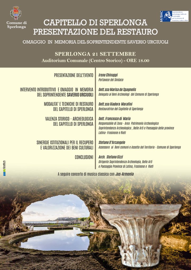 Sabato 21 settembre alle ore 18 presso l’Auditorium comunale, situato nel centro storico, ci sarà l’evento atteso della presentazione del restauro del capitello ritrovato di Sperlonga. L’evento, in memoria al soprintendente Saverio Urcioli, vedrà diversi interventi, tra cui quelli del sindaco di Sperlonga Armando Cusani, dell’assessore ai Beni Comuni Stefano D’Arcangelo e molti altri. Sarà l’occasione anche per riscoprire, attraverso il capitello, un pezzetto in più della storia affascinante che avvolge Sperlonga.