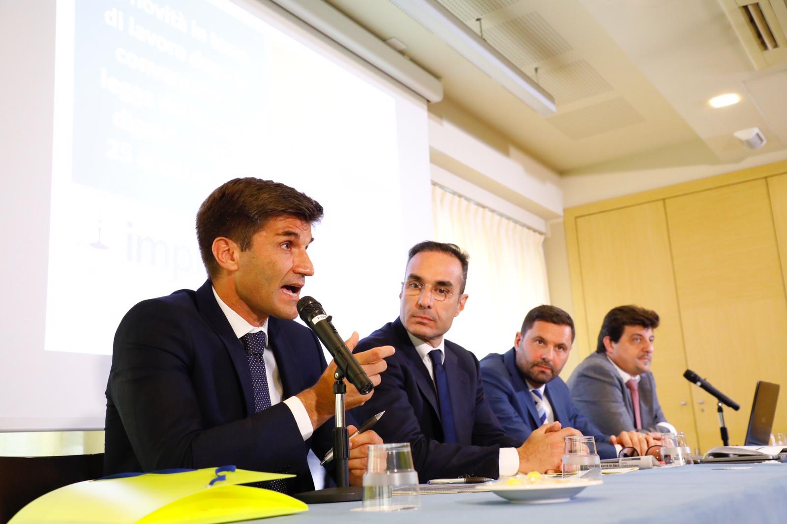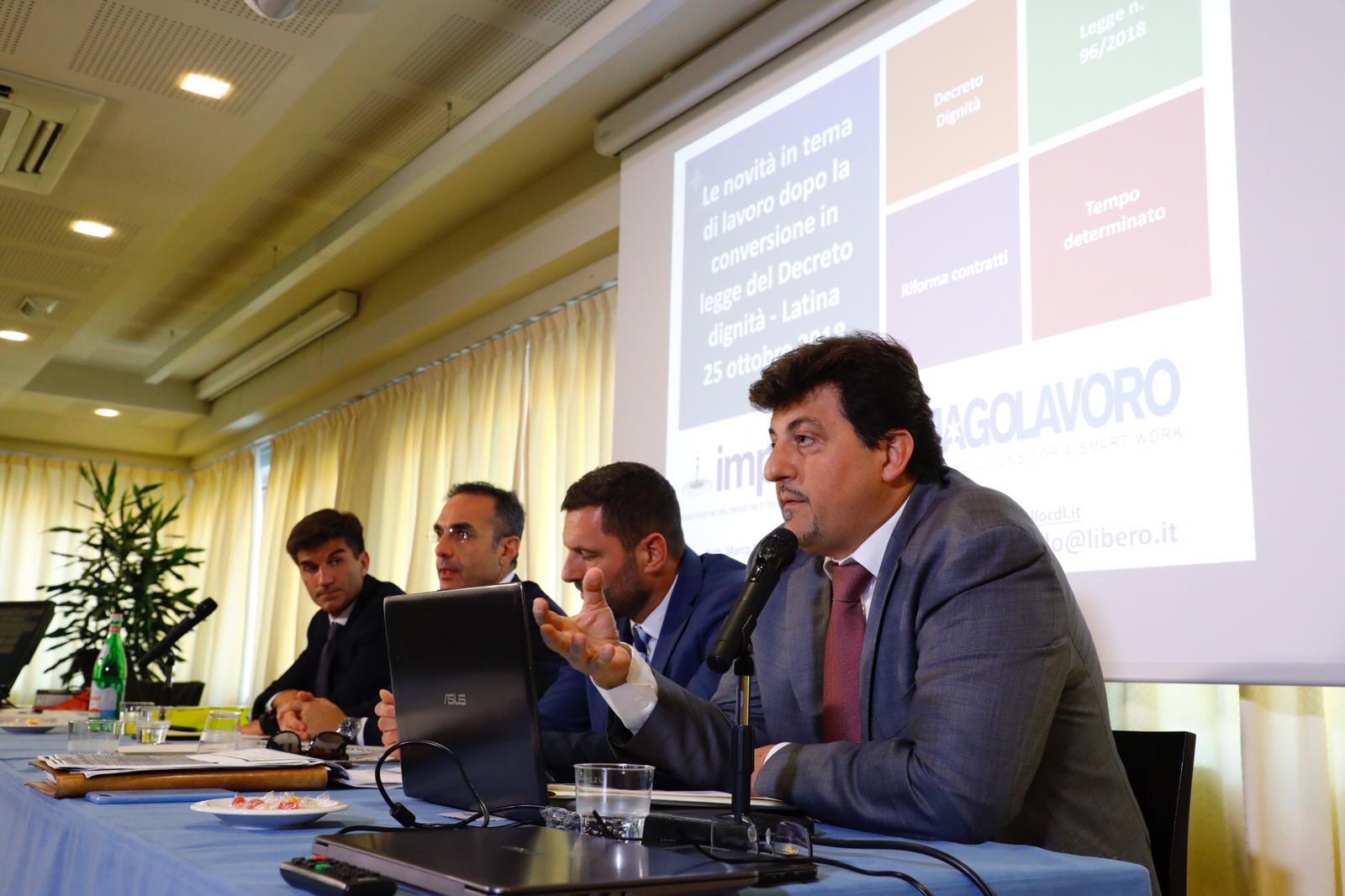 Le novità introdotte dal Decreto Dignità sono state al centro del Focus organizzato giovedì 25 ottobre, presso l’Hotel Europa di Latina, da IMPRESA, Associazione dell’Industria e delle Piccole e Medie Imprese, e supportato da Magolavoro in qualità di sponsor. Un successo oltre le aspettative, testimoniato dalla grande affluenza di pubblico, composto da imprenditori, rappresentanti delle agenzie interinali ma anche semplici cittadini, lavoratori, che hanno voluto approfondire la nuova normativa che presenta alcuni nodi cruciali. Sul tavolo dei relatori il Dott. Marco Militello, consulente del lavoro e l’Avvocato Giuslavorista Gianluca Marchionne, i cui interventi sono stati preceduti dal saluto, del Presidente di IMPRESA Giampaolo Olivetti e del Direttore Generale Saverio Motolese che ha moderato l’incontro. “Questo Decreto merita una riflessione importante – esordisce Motolese – poiché tocca un nervo sensibile delle aziende. In questi ultimi anni c’è stato un sostanziale cambiamento del mondo del lavoro, che ha seguito quello che ha riguardato l’economia, caratterizzato principalmente da un drastico calo della domanda. Oggi per un’impresa è difficile fare una programmazione a lungo termine, poiché si lavora con domande a breve termine. Questo Decreto costringerà le aziende a rivedere e riprogrammare in modo più restrittivo i rapporti di lavoro perché si restringe il campo di quella quota di lavoratori che segue la domanda a breve termine. Bisogna intervenire ma senza mettere i lavoratori e gli imprenditori di fronte ad un bivio. L’obiettivo di un’associazione come la nostra è quello di fornire informazioni per far conoscere le novità del Decreto, ma interverremo anche successivamente, nell’aiutare gli imprenditori a gestire e applicare queste novità all’interno dell’azienda”.