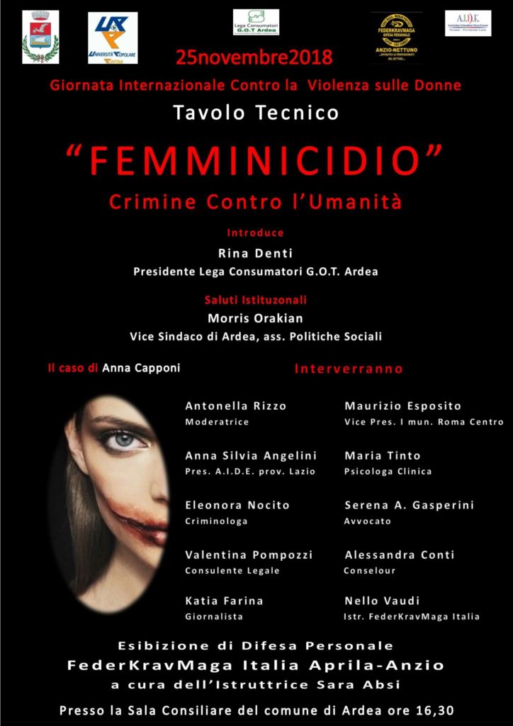 Il 25 novembre 2018 il Comune di Ardea, in occasione della Giornata Internazionale contro la violenza sulle Donne, richiama l’attenzione della cittadinanza sulla piaga del femminicidio alle 16.30 presso la sala consiliare del comune di Ardea. La Lega Consumatori G.O.T Ardea, in collaborazione con AIDE Nettuno provinciale lazio, organizza il TAVOLO TECNICO “Femminicidio! Crimine contro l’umanità” avvalendosi della presenza di grandi esperti e professionisti nel settore della prevenzione. L’evento sarà moderato dalla scrittrice Antonella Rizzo e prevederà l’intervento di Rina Denti, Presidente Lega Consumatori G.O.T Ardea; i saluti istituzionali di Morris Orikian, Vicesindaco e di Maurizio Esposito, Vice Presidente I° Municipio Roma Centro; gli interventi di Anna Silvia Angelini, Presidente AIDE Nettuno provinciale Lazio; Katia Farina, Giornalista; Eleonora Nocito, Criminologa; Serena A. Gasperini, Avvocata; Nello Vaudi, Istruttore FederKravmaga Italia; Maria Tinto, Psicologa clinica; Alessandra Conti, Conselour; Valentina Pompozzi, Consulente Legale. Sarà presente la Vigilessa Anna Capponi, protagonista di una vicenda di attualità giudiziaria. Durante il Tavolo tecnico verranno affrontate, inoltre, le problematiche connesse alla violenza sulle donne, proponendo azioni di contrasto e prevenzione realmente efficaci,denuncia e ammonimento,come difendersi dalle minacce, l’iter della compilazione della denuncia. Il 25 novembre è stato scelto nel 1999 come Giornata internazionale per l’eliminazione della violenza contro le donne dall’Assemblea Generale della Nazioni Unite. Questa data fu scelta in ricordo del brutale assassinio nel 1960 delle tre sorelle Mirabal, considerate esempio di donne rivoluzionarie per l’impegno con cui tentarono di contrastare il regime dittatoriale nella Repubblica Dominicana. La Dichiarazione delle Nazioni Unite sull’eliminazione della violenza contro le donne del 1993 ha definito quest’ultima come violazione dei diritti umani ed in particolare all’art.2, specifica che essa riguarda: la violenza fisica , sessuale e psicologica nel contesto domestico e perpetrata da membri della famiglia; la violenza fisica, sessuale e psicologica che avviene all’interno della comunità in generale; la violenza fisica, sessuale e psicologica perpetrata o tollerata dallo Stato, ovunque si manifesti. L’ONU e l’Unione Europea definiscono violenza di genere quella che “si annida nello squilibrio relazionale tra i sessi e nel desideri di controllo e di possesso da parte del genere maschile sul femminile”. Nel 2006 il termine viene trasformato in “femminicidio” dalla parlamentare messicana Marcela Lagarde per definire la forma estrema di violenza di genere contro le donne attraverso varie condotte misogine.Durante il Tavolo Tecnico Verrà esposta la mostra fotografica “Prenditi cura di Te” a cura della fotografa Francesca Barbera.