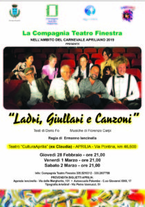 Un Carnevale all’insegna dell’arte ad Aprilia che, oltre alla consueta sfilata dei carri allegorici, vedrà la mise en scène di “Ladri, giullari e canzoni” il 28 febbraio, il 1 e il 2 marzo presso il teatro CulturAprilia di via Pontina, km 47. Lo spettacolo, a cura della Compagnia Teatro Finestra per la regia di Ermanno Iencinella, è tratto da un testo di Dario Fo con le musiche di Fiorenzo Carpi ed è stato inserito nel programma del carnevale Apriliano 2019, organizzato dalla Pro Loco di Aprilia. Sul palco ci saranno Salvatore Romano, Lidia Colabella, Paolo Suppa, Dora Nevi, Robert Sibu, Monica Laurenzi, Adelaide Grimaldi e Gianni Bernardo. Lo spettacolo fonde la farsa di Fo “Non tutti i ladri vengono per nuocere” e le “canzoni” utilizzate nei suoi lavori teatrali. L’intento è di far scoprire meccanismi teatrali, in questo caso comico-grotteschi, che ancora oggi, dopo più di cinquant’anni, hanno la loro validità e freschezza. La Compagnia Teatro Finestra ha messo in scena 42 anni fa per la prima volta questo spettacolo riscuotendo grande successo. Lo ha riproposto due anni fa in occasione della morte di Dario Fo registrando il tutto esaurito e lo mette in scena ora, con altre tre serate che a qualche giorno dalla rappresentazione sono tutte sold out. “Ladri, giullari e Canzoni” vuole essere una sorta di “saluto” al teatro CulturAprilia, l’ex fabbrica Acqua Claudia che da decenni è la “casa” della compagnia. La sala teatrale infatti sarà oggetto nei prossimi mesi di un lavoro di restyling e messa in sicurezza grazie al “bando regionale per la realizzazione di investimenti di carattere locale”, che ha portato nelle casse del Comune di Aprilia un finanziamento di 412 mila euro.
