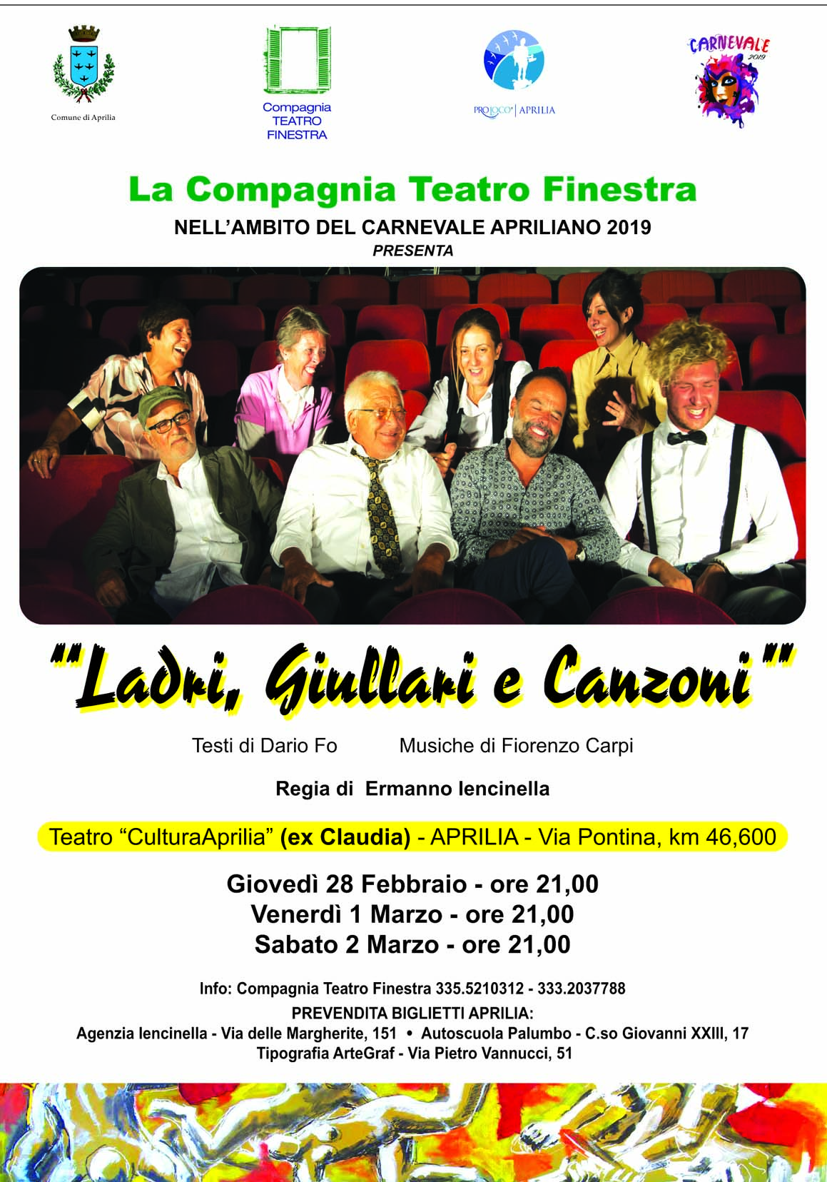 Un Carnevale all’insegna dell’arte ad Aprilia che, oltre alla consueta sfilata dei carri allegorici, vedrà la mise en scène di “Ladri, giullari e canzoni” il 28 febbraio, il 1 e il 2 marzo presso il teatro CulturAprilia di via Pontina, km 47. Lo spettacolo, a cura della Compagnia Teatro Finestra per la regia di Ermanno Iencinella, è tratto da un testo di Dario Fo con le musiche di Fiorenzo Carpi ed è stato inserito nel programma del carnevale Apriliano 2019, organizzato dalla Pro Loco di Aprilia. Sul palco ci saranno Salvatore Romano, Lidia Colabella, Paolo Suppa, Dora Nevi, Robert Sibu, Monica Laurenzi, Adelaide Grimaldi e Gianni Bernardo. Lo spettacolo fonde la farsa di Fo “Non tutti i ladri vengono per nuocere” e le “canzoni” utilizzate nei suoi lavori teatrali. L’intento è di far scoprire meccanismi teatrali, in questo caso comico-grotteschi, che ancora oggi, dopo più di cinquant’anni, hanno la loro validità e freschezza. La Compagnia Teatro Finestra ha messo in scena 42 anni fa per la prima volta questo spettacolo riscuotendo grande successo. Lo ha riproposto due anni fa in occasione della morte di Dario Fo registrando il tutto esaurito e lo mette in scena ora, con altre tre serate che a qualche giorno dalla rappresentazione sono tutte sold out. “Ladri, giullari e Canzoni” vuole essere una sorta di “saluto” al teatro CulturAprilia, l’ex fabbrica Acqua Claudia che da decenni è la “casa” della compagnia. La sala teatrale infatti sarà oggetto nei prossimi mesi di un lavoro di restyling e messa in sicurezza grazie al “bando regionale per la realizzazione di investimenti di carattere locale”, che ha portato nelle casse del Comune di Aprilia un finanziamento di 412 mila euro.