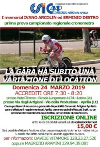Domenica 24 marzo dalle ore 9, si terrà la prima prova del Campionato Regionale a Cronometro presso l’area del Consorzio degli Artigiani di Aprilia. Si tratta della prima manifestazione sportiva realizzata all’interno dell’area consortile. La manifestazione è organizzata dal Centro Sportivo Italiano – Comitato Provinciale di Latina con il patrocinio del CAAP, e prevede il seguente programma: 7.30 apertura accoglienza ed accrediti – 8.55 chiusura del percorso – 9.00 partenza primo atleta – 11.00 arrivo ultimo atleta (sulla stima di un max di 90 partenti) – 11.05 riapertura della circolazione stradale – 11.45 premiazioni. Le iscrizioni on-line sono ancora aperte.