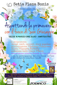 Conto alla rovescia per la nuova manifestazione promossa dall’associazione culturale Setia Plena Bonis. Sabato 16 marzo, presso l’area verde dell’Anfiteatro di Sezze, il sodalizio setino organizza “Aspettando la primavera con il fuoco di San Giuseppe”. Ricco il programma dell’evento che gode del patrocinio del Comune di Sezze. A partire dalle ore 20,00 infatti è prevista l’accensione del falò di San Giuseppe, nel rispetto della tradizione popolare setina. E proprio intorno al falò quale simbolo di purificazione e rito propiziatorio saranno avviate una serie di iniziative che prevedono balli, canti, racconti popolari e musica dal vivo. In occasione della manifestazione si terrà anche la prima edizione della “Madonna Primavera”, un concorso al quale prenderanno parte donne over 40 con caratteristiche e attitudini quali eleganza, cordialità, personalità e bellezza. In programma anche una sfilata e giochi di fuoco delle Majorette Butterfly di Sezze e l’esibizione di ballo di Daniele e Martina di Dance Mania. E poi ancora dimostrazione artistica floreale da parte di Fiori d’Arancio di Sezze, esibizione del coro Donne in Fiore e del chitarrista Jonathan Ginolfi. Durante la serate potranno essere degustati i panini farciti di Angelo e Monia e paella e sangria della Taverna Iberica di Sezze. Insomma un evento da non perdere, curato nei dettagli con il marchio di una associazione che in breve tempo è entrata in completa armonia con la sua comunità.