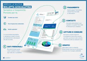 Arriva la nuova bolletta Acqualatina. Semplice e trasparente. Pensata per te. In distribuzione nei prossimi giorni, con un opuscolo informativo. Acqualatina dà vita a una nuova bolletta: semplice e trasparente, pensata per te. Un formato grafico più leggibile, termini più chiari, voci di spesa evidenziate e grafici esplicativi, per consentire una lettura più agevole. La prima pagina è stata divisa in 5 sezioni, organizzate in modo tale da avere subito a portata di mano tutto ciò di cui si ha bisogno: DATI PERSONALI. Con tutti i codici necessari a identificare velocemente la propria utenza, facilitando anche i contatti con il Gestore. DATI DI PAGAMENTO. Con gli importi fatturati, eventuali bollette in sospeso e ogni altra informazione utile al pagamento. CONTATTI. Dove trovare tutte le indicazioni per contattare il Servizio Clienti Acqualatina. LETTURE E CONSUMI. Per tenere sempre sotto controllo l’andamento dei consumi e le letture. GRAFICI. In questa sezione si possono trovare i grafici che mostrano la suddivisione dei costi addebitati in bolletta, così da comprenderne meglio la composizione. Nelle altre pagine si possono consultare i dettagli dei costi, la data di lettura effettiva del contatore e la procedura per effettuare l’autolettura, i dati di eventuali conguagli, il codice per pagare tramite circuito SISAL e le modalità per richiedere l’addebito diretto sul conto corrente. La nuova bolletta sarà in distribuzione dai prossimi giorni, con allegato un opuscolo illustrativo riportante la descrizione di ognuna delle sezioni principali.