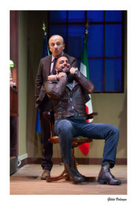 In un classico commissariato di provincia, il vice questore Eduardo Piscitelli, conduce da sempre il proprio lavoro nel rispetto del più integerrimo rigore, con la consapevolezza di svolgere le mansioni di garante dell’ordine pubblico e difesa della sicurezza del cittadino con la tenacia e la fede di un missionario, inviato dal cielo esclusivamente per ripulire la terra dalle nefandezze degli uomini scellerati che minacciano la gente cristiana che vorrebbe condurre in pace una vita serena… Nell’ufficio del paladino Eduardo, si barcamenano una serie di fidi scudieri nel tentativo di debellare “le barbarie di tutti i santi giorni”…dall’inossidabile tartassato ispettore Murolo, ai giovani agenti rampanti Varriale, Di Lauro e Farina, all’esperta rassicurante sovrintendente Signorelli…una sorta di cavalieri della tavola rotonda, attorno alla quale si aggirano le insidie quotidiane della delinquenza spicciola, lontana sì dagli echi mortali del terrorismo mondiale, ma angosciosamente vicina al respiro del singolo cittadino, a difesa del quale il vice questore si vedrà costretto all’inevitabile sacrificio di un capro espiatorio a lui tristemente noto, tale Michele Donnarumma, vittima predestinata, agnello feroce dall’aspetto inquietante, che sconvolgerà la salda religione di Piscitelli, come il più spietato e barbaro dei saraceni! Solo allora, il paladino Eduardo per la prima volta nella sua vita, cercherà conforto nel tepore degli affetti familiari, trovando così rifugio tra le mura sicure della propria casa di montagna, dove ad attenderlo ci saranno suo padre ex colonnello dell’esercito affetto da Alzheimer, la dottoressa Cuccurullo sua neurologa di fiducia, e Gina bisbetica badante rumena, che con amorevole follia proverà a nascondere strenuamente una verità segregata da anni nel suo cuore… E come nella più classica sceneggiatura thriller, anche i saldi ed integerrimi comandamenti del vice questore Piscitelli vacilleranno di fronte all’imprevedibile colpo di scena finale. Colpo di scena scritto, diretto e interpretato da Carlo Buccirosso con Gino Monteleone, Gennaro Silvestro, Peppe Miale, Monica Assante di Tatisso, Elvira Zingone, Giordano Bassetti, Fiorella Zullo, Matteo Tugnoli, Roberta Gesuè, scene Gilda Cerullo e Renato Lori, musiche Paolo Petrella, costumi Zaira de Vincentiis, disegno luci Francesco Adinolfi, consulenza speciale Luciano Nigro, aiuto regia Martina Parisi, coordinatore effetti speciali Simone Petrella, foto di scena Gilda Valenza, produzione Ente Teatro Cronaca Vesuvioteatro, produzione esecutiva A.G. Spettacoli