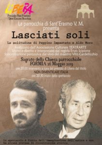 È una ricerca storica, quella che il regista/attore Enzo Scipione, evidenzia nella stesura dello spettacolo teatrale “Lasciati soli” accostando, con coraggio, due personaggi distanti tra loro, mai incontrati durante la loro vita terrena, con una data che gli accomuna, quella della loro morte. Peppino Impastato ed Aldo Moro, comunista uno, democristiano l’altro, personaggi politici amati e odiati nello stesso tempo, convinti delle loro idee fino al tragico epilogo. Il regista ha cercato, in questo viaggio una chiave di lettura inusuale, la solitudine di questi due grandi politici di cui si è tanto parlato nel secolo scorso.Tre anni di lavoro che hanno portato l’attore Enzo Scipione fino a Cinisi, paese natio di Peppino Impastato, ad incontrare Giovanni Impastato per poi far visita alla “casa memoria Felicia e Peppino Impastato” per reperire documenti necessari per la stesura del testo ed in ultimo a Roma ad incontrare Salvo Vitale, amico d’infanzia di Peppino.Lo spettacolo è accompagnato da un sonorizzazione percussiva dal vivo eseguita del maestro Vito Cardellicchio, che è riuscito a tramutare in suono il sentimento dei due personaggi. E’ un monologo duro, coinvolgente, e ricco di spunti, della durata di cinquanta minuti. Lo spettacolo andrà in scena nel sagrato della Chiesa Parrocchiale di Sant’Erasmo domani alle ore 20.30.