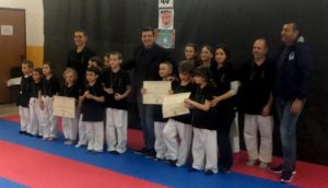 “Uno per tutti ASD Sport per tutti” così comincia l’esibizione da dietro il tendone dove tutti gli atleti,bambini da 4 a 13 anni si sono preparati per salire ed esibirsi sul tatami in “Smonto il bullo”. Non è una semplice esibizione quella che è andata in scena nella Scuola Primaria di Sermoneta Scalo ma una rappresentazione teatrale sportiva. “Sport per tutti” diretta dal Maestro di Karate Nicola Marone per tre anni scolastici dal 2017 a oggi ha svolto nelle varie scuole dell’Istituto Comprensivo Statale “Donna Leila Caetani” corsi di difesa personale contro il bullismo, che ha avuto lo scopo di far crescere i ragazzi in sicurezza, autostima e fiducia in se stessi oltre all’insegnamento del karate, disciplina che se insegnata bene, non fa altro che educare l’atleta al rispetto delle regole. Andrea CASSANDRA, Christian DE ANGELIS, Flavio CENNICOLA, Manuela PACINI, Carta SOFIA, Giovanni TAFUTO, Manuel BARONE, Federico ROSTIROLLA, Gianluca BRUNI, Maria Chiara ANDRIULO, Sara PULCINI, Emilio MARIGLIANI, Monica MARONE e Valeria MARIGLIANI si sono esibiti alternandosi tra recitazione e tecniche di karate…. Ecco cosa ha di nuovo questa esibizione. “Smonto il bullo è una rappresentazione nata quasi per gioco, quando i bambini prima di iniziare le lezioni di karate mi raccontavano quello che gli accadeva con i compagni in classe – ha spiegato il Maestro – Ho preso spunto dai loro racconti per scrivere questi dialoghi e far capire loro come affrontare e vincere le loro insicurezze e come affrontare gli eventi e le varie problematiche che incontreranno nel corso della loro vita senza l’utilizzo della violenza”. L’esibizione “Smonto il bullo” è cominciata con un saluto e subito in scena tre ragazze Monica, Sara e Valeria, spaventate dagli scherzi di Christian e Federico che avvenivano in classe e fuori. Le tre ragazze sono state invitare da Sofia a un corso di difesa personale e da qui una esibizione in piena regola di Karate dove si è visto il resto dei ragazzi esibirsi in un allenamento basico misto al training funzional. Poi tutti in classe dove le ragazze non hanno più paura dei bulli anzi li ridicolizzano davanti a tutti. Fuori dalla classe soccorrono Maria Chiara anche lei presa di mira. Le ragazze sicure non hanno paura delle angherie dei bulli anzi si difendono da loro per poi fargli capire che dobbiamo essere tutti amici. Ha partecipato anche Valerio Daniele Presidente provinciale OPES che si è complimentato con le ragazze che hanno ottenuto il titolo di Campionesse Italiane di Karate e ha rilasciato un “Attestato di Merito Sportivo” a i ragazzi che hanno partecipato al Campionato Italiano e regala una medaglia a tutti i ragazzi. Un ringraziamento è stato riconosciuto anche alla Direttrice Artistica del progetto Teresa Mazzuoccolo, e Fabrizio Forte Direttore del Sermoneta Shopping Center.
