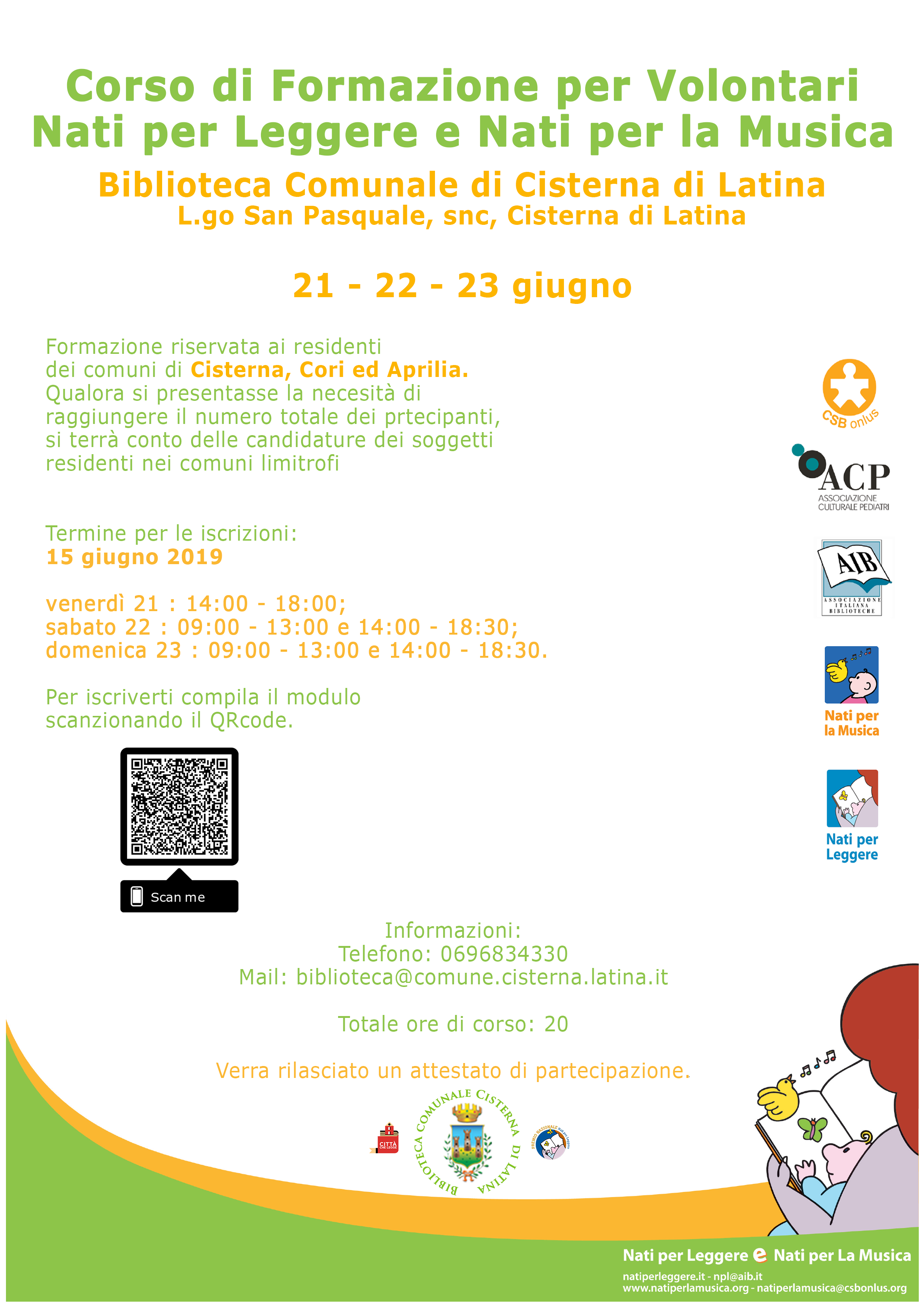Il gruppo di volontari Nati per Leggere di Cisterna, in collaborazione con la Biblioteca comunale e il Centro per la salute del bambino ONLUS, organizzerà un corso di formazione per lettori volontari che si terrà rispettivamente il 21, 22 e 23 giugno nella Biblioteca Comunale di Cisterna di Latina, a sostegno della rete già presente sul territorio di Cisterna, Cori e Aprilia. Il corso NpL e NpM per volontari, della durata di due giornate e mezzo, è destinato a persone interessate a divenire volontari, che si impegnano a diffondere la promozione della musica e della lettura nella fascia 0-6 anni a livello territoriale. Obiettivi generali del corso di formazione sono far conoscere le finalità, i principi portanti e le modalità operative per promuovere la lettura e la musica in età 0-6 nel proprio territorio, i ruoli dei volontari, i benefici per il bambino della lettura, le fasi di sviluppo del bambino, le caratteristiche dei libri più adatti dalla nascita ai 6 anni, le modalità di lettura. Si ritiene che l’iniziativa rappresenti un’importante occasione di promozione della lettura ad alta voce, volta a diffondere la conoscenza e la sinergia tra la Biblioteca comunale, le istituzione sanitarie e il mondo educativo al fine di sostenere lo sviluppo dell’abitudine di leggere ai bambini fin dai primi mesi di vita. Il corso sarà riservato ad un massimo di 30 partecipanti e sarà pertanto necessario effettuare la selezione dei candidati con valutazione di un questionario da compilare al seguente link https://forms.gle/MG1FvRgeVWS8c7Mk8. Gli interessati sono dunque invitati a mettersi in contatto con la biblioteca inviando una manifestazione d’interesse all’indirizzo biblioteca@comune.cisterna.latina.it – tel 0696834330 / 0696834351. Il valore del corso sarà di 80€ e il termine per le iscrizioni è fissato a sabato 15 giugno.