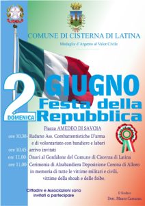 La data del 2 giugno a Cisterna vorrà essere celebrativa non solo dell’istituzione della Repubblica italiana, ma anche di tutti coloro che prima del raggiungimento della democrazia e della libertà hanno subìto le assurde atrocità della persecuzione, della violenza e dei drammi connessi con la guerra. La cerimonia prenderà il via in Piazza Amedeo di Savoia alle ore 10.30 con il raduno delle associazioni combattentistiche, d’Arma e di volontariato con bandiere e labari. Successivamente giungeranno le autorità militari, civili e religiose. Alle 11, dinanzi al monumento ai Caduti di tutte le Guerre, inizierà la cerimonia di Alzabandiera, seguita dalla deposizione della corona d’alloro in memoria di tutte le vittime militari e civili, vittime della shoah e delle foibe. Allocuzioni. Tutti i cittadini sono invitati a partecipare.