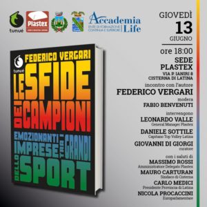 Un pomeriggio di cultura, sport e storia recente dell’Italia. Saranno questi i temi affrontati nel corso dell’iniziativa in programma oggi alle ore 18,00, a Cisterna alla presenza di tanti ospiti. L’occasione sarà la presentazione al pubblico del libro “Le sfide dei campioni”, di Federico Vergari, opera presente in tutte librerie a livello nazionale. Il libro racconta grandi dualismi dello sport italiano che sono anche lo spunto per raccontare la storia d’Italia. Insieme all’autore, ne parlerano: Daniele Sottile – Capitano della Top Volley Latina; Leonardo Valle – General Manager di Plastex, azienda pontina leader in Italia nel settore della copertura di impianti sportivi; Giovanni Di Giorgi – Curatore della collana sport di Tunué, la casa editrice del libro; Massimo Rossi – Amministratore Delegato di Plastex; Mauro Carturan – Sindaco di Cisterna; Carlo Medici – Presidente della Provincia di Latina; Nicola Procaccini – Europarlamentare.Moderatore dell’incontro sarà il giornalista Fabio Benvenuti. L’evento gode del patrocinio del Comune di Cisterna e della Provincia di Latina. L’incontro si terrà presso la sede dell’azienda Plastex, in via P. Ianiri, 8 a Cisterna.