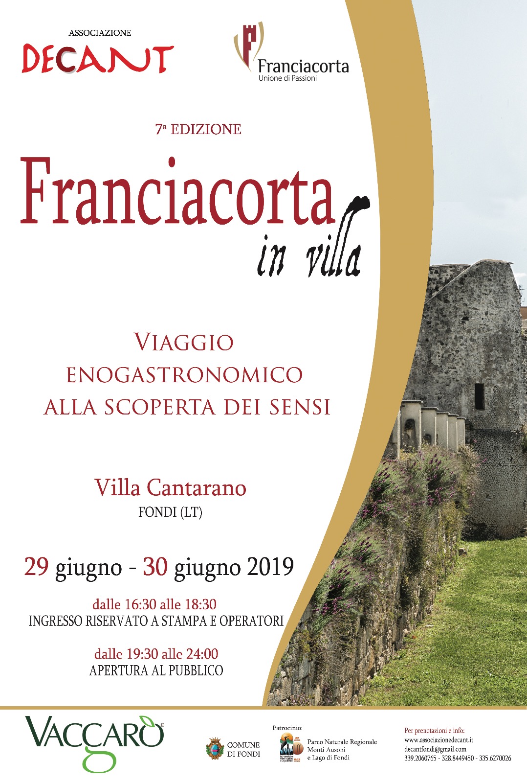 Anche quest’anno il “viaggio enogastronomico alla scoperta dei sensi” va verso un sold out anticipato. Gli ultimi biglietti disponibili per Franciacorta in Villa, il format dell’associazione Decant sinonimo di gusto ed eleganza, si possono acquistareon line su www.associazionedecant.it e presso Futurgrafica in via Arnale Rosso a Fondi, GlobalTel Corso G. Matteotti, 149 a Latina. L’appuntamento con l’evento patrocinato dal Consorzio Franciacorta è per il 29 e il 30 giugno 2019 dalle19.30 alle 24.00, con un’apertura anticipata riservata alla stampa e agli operatori dalle 16.30 alle 18.30. La due giorni vedrà protagoniste tante aziende vitivinicole della Franciacorta e operatori gastronomici locali: un vero e proprio viaggio enogastronomico alla scoperta dei sensi nella meravigliosa cornice di Villa Cantarano. Non mancherà un momento di approfondimento con il seminario “Franciacorta alla prova del Tempo”, programmato per sabato. Saranno inoltre 20 le Aziende del Franciacorta a partecipare con i loro insuperabili vini: 1701 Franciacorta, Abrami Elisabetta, Antica Fratta, Berlucchi Guido, Bonfadini, Bosio, Ca’ del Bosco, Camilucci, Camossi, Ferghettina, La Costa di Ome, La Fiòca, La Torre, Le Marchesine, Majolini, Marchesi Antinori Tenuta Montenisa, Mirabella, Turra, Villa Crespia e Villa Franciacorta.