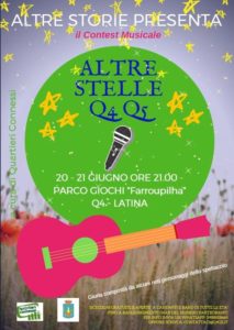 Torna per la sua seconda edizione la rassegna culturale “Altre Storie” a cura dell’Associazione Quartieri Connessi, realizzata in collaborazione con la Parrocchia San Luca, l’Istituto Comprensivo Don Milani, Centro Sociale Q4 e le Associazioni: Botteghe Invisibili, Domus Mea, Il Gigante Buono, Il Sandalo, Latina Oasi Verde, Mama’s Soul Beats. Doppia veste per la manifestazione che avrà in programma sei giorni di eventi nella sua edizione estiva nei fine settimana del 22 e 23 e 29 e 30 giugno, con un’anteprima giovedì 20 e venerdì 21 giugno; e un’edizione autunnale che si svolgerà nelle giornate del 4, 5 e 6 ottobre. Una rassegna che già dall’anno scorso ha mostrato la sua vocazione di intrattenimento e allo stesso tempo impegno per la collettività, in particolare per i quartieri Q4 e Q5. Quest’anno i temi sono tanti e spiccano soprattutto l’attenzione per la nostra storia, e dunque il racconto dell’Agro Pontino e una romantica e istruttiva passeggiata con il naso all’insù per ammirare le stelle e la luna, nell’anno in cui si festeggia il 50° anniversario del primo allunaggio dell’uomo. Come è d’obbligo in una manifestazione estiva che si rispetti non mancherà l’area ristoro: nelle prime serata in Q4 si potranno gustare ottimi panini, piatti di verdure grigliate presso il Chiosco del Parco e sarà presente un’ape food truck che distribuirà l’ottima birra Losa, la birra pontina che ha ricevuto importanti riconoscimenti sia in Italia che all’estero. In Q5 invece l’area ristoro sarà a cura dei volontari e dei boy-scout e della parrocchia San Luca che prepareranno per i visitatori un’ampia scelta di piatti gustosi e cocomero per tutti! Altre Stelle il contest musicale di Altre Storie. Si partirà dunque giovedì 20 e venerdì 21 giugno con l’anteprima di “Altre Storie” ovvero “Altre Stelle”: il contest musicale al quale parteciperanno 12 concorrenti tra cantanti, band e musicisti compresi tra i 13 e i 35 anni. I giovani talenti si esibirannopresso il Parco “Farroupilha” in via Cherubini, quartiere Q4,a partire dalle ore 21.00 proponendo musica per tutti i gusti: da un brano di musica classica eseguito al pianoforte all’esibizione di due rapper oltre al pop italiano e il blues rock anglo-americano. Tra i giurati che valuteranno i partecipanti anche il noto conduttore televisivo Luca Sardella e sua figlia Daniela. Il concorso canoro sarà preceduto alle ore 19.00 da un incontro a cura di Quartieri Connessi per parlare insieme ai cittadini di criticità e problematiche relative alla quotidianità in Q4 e Q5.Ricco il programma del primo fine settimana di eventi di“Altre Storie” che si terrà sempre presso il Parco “Farroupilha.”La rassegna prenderà dunque il via sabato 22 giugno alle ore 19.00 con la performance di Tai Chi a cura dell’Associazione Arte in Movimento. Alle ore 20.00 l’Associazione Semi di Pace presenterà il “Progetto Germogli” che ha lo scopo di fornire gratuitamente ai minori e alle famiglie in difficoltà economica interventi in ambito psicologico, neuropsicologico, psicoterapeutico, logopedico e neuropsicomotorio.La serata si concluderà in musica con il concerto delle Mamas Soul Beats. Il coro, formato da super mamme e super donne con la passione per il canto, è attivo dal 2012 con un repertorio che spazia tra i grandi successi della musica leggera italiana e il pop-rock internazionale. Altrettanto interessante il programma di domenica 23 giugno: alle ore 19.00 si terrà il laboratorio di Disegno, Arte e Comunicazione tenuto da Daniele Frisina e Ferdinando Cedrone. La serata proseguirà con il concerto della storica band pontina La Maglia della Salute al secolo Piergiorgio Ensoli voce, Mauro Miletta chitarre, Salvatore Cataldo basso, Marco Libanori batteria percussioni. Nel secondo weekend di eventi Altre Storie cambia sede e si sposta presso l’Anfiteatro della Parrocchia San Luca in via Pierluigi da Palestrina. Sarà un fine settimana dedicato al racconto dell’Agro Pontino, della sua storia, i miti e le tradizioni e all’astronomia con la celebrazione dei 50 anni da quando il primo uomo ha messo piede sulla luna.