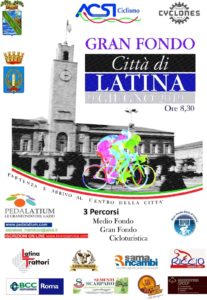 Si terrà domenica 9 giugno la prima Gran Fondo Città di Latina, una gara Ciclistica Amatoriale inserita nel Campionato Regionale Acsi Ciclismo e Circuito Pedalatium, cuore della manifestazione lo Stadio Francioni, partenza da Piazza San Marco. La gara prevede tre circuiti un Gran Fondo, un Medio Fondo e un percorso Cicloturistico con difficoltà diverse. La Cicloturistica prevede un percorso di circa 56 km con un dislivello 440 mt e, partendo da piazza San Marco, attraverserà i Comuni di Latina, Sermoneta, toccherà i Giardini di Ninfa, attraversa il Comune Cisterna per poi ricongiungersi con la Medio Fondo e Gran FondoLatina che invece proseguiranno per gli Archi di San Lidano e seguiranno alcune deviazioni con un percorso che assumerà difficoltà diverse. Il Medio Fondo si snoderà su un percorso di 110 km e avrà una difficoltà di dislivello pari a 1550 mt, i concorrenti durante la competizione saranno assistiti da cinque punti ristoro. La Gran FondoLatina, la più faticosa, si svilupperà su un percorso di 143 km e un dislivello 2200 mt, per gli atleti del Gran Fondo, sette i punti ristoro fra Latina e Cisterna passando da Priverno, Roccagorga, Sezze, Bassiano e Sermoneta. La prima Gran Fondo Città di Latina vede il patrocinio della Regione Lazio, del Comune e della Provincia di Latina ed il sostegno del CONI, dell’Acis Ciclismo e di Pedalatium. L’accoglienza e la consegna dei materiali per la gara saranno disponibili a cominciare dalle ore 15.00 di sabato 8 giugno all’interno dello Stadio Comunale Domenico Francioni. Nell’area sarà allestito un vero e proprio villaggio con intrattenimento ed iniziative per tutti i partecipanti con tanto di Pasta Party, servizio docce e base operativa per tutte le operazioni di gara. Il Villaggio chiuderà alle ore 19.30 di sabato ma sarà operativo già alle ore 6.30 di domenica per le ultime iscrizioni prima della partenza prevista in piazza San Marco a cominciare dalle ore 8.30. ci si può iscrivere anche online scaricando il modulo sul sito www.pedalatium.com