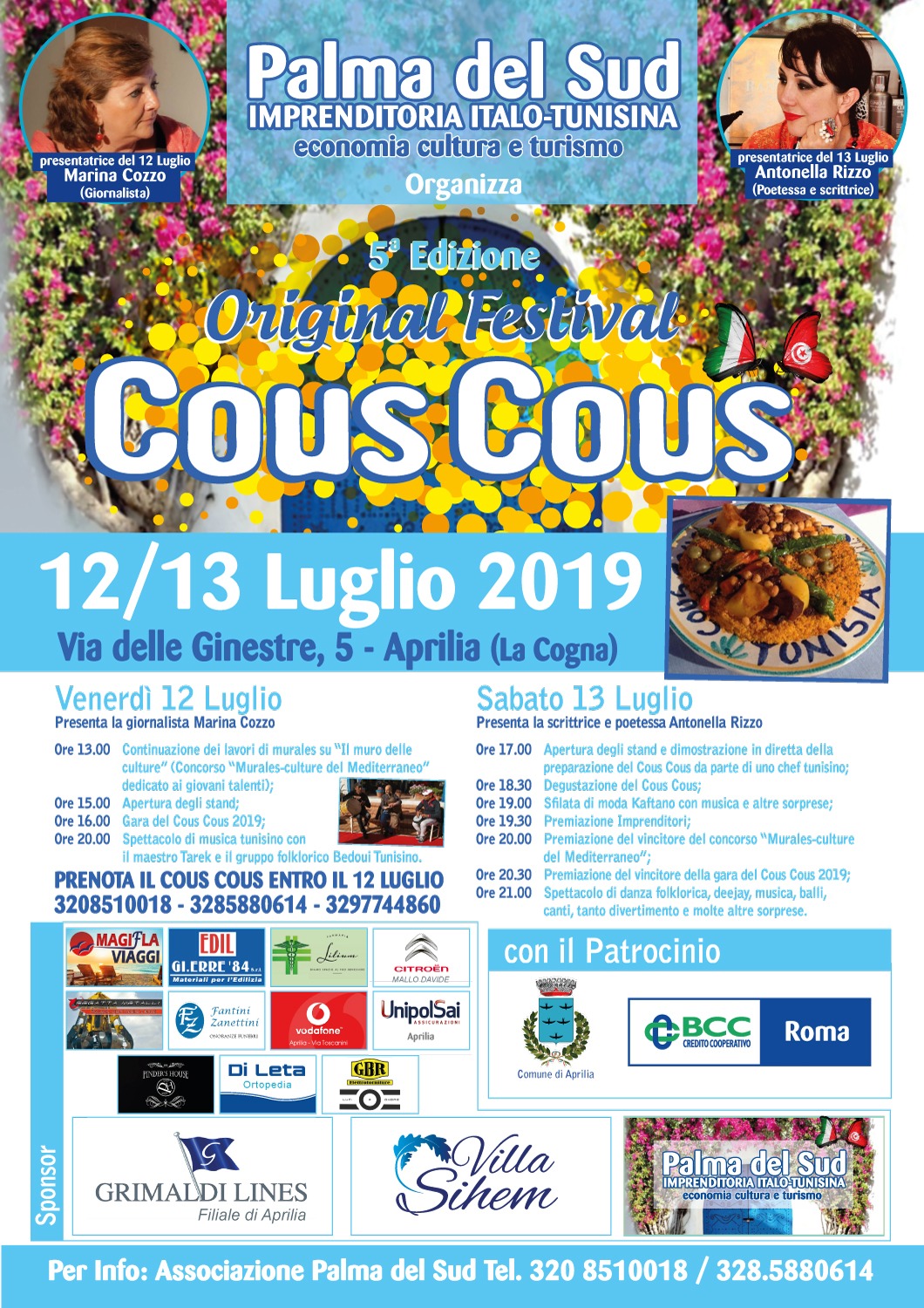 Tutto pronto per la quinta edizione dell’Original Festival del Cous Cous. Torna l’evento estivo annuale organizzato dall’associazione La Palma del Sud Imprenditoria e dal Comitato del Festival del Cous Cous presso la sede della suddetta associazione, situata nel quartiere La Cogna ad Aprilia, in via delle Ginestre n.5. A differenza delle edizioni precedenti, quest’anno il Festival sarà diviso in due giornate: venerdì 12 Luglio e sabato 13 Luglio. Venerdì 12 Luglio si terrà la tradizionale gara del Cous Cous che, come ogni anno, vede chef provenienti da tutto il mondo sfidarsi con questa famosa pietanza mediterranea, simbolo di integrazione e intercultura. A decretare chi sarà il vincitore del Premio Miglior Cous Cous 2019 ci sarà una giuria tecnica composta da personaggi illustri. Accanto alla tradizionale gara si terrà la novità assoluta di questa quinta edizione 2019: il Concorso del “Murales-Culture del Mediterraneo” dedicato ai giovani talenti che racconteranno con immagini e colori la cultura mediterranea. Un modo questo per sconfiggere, attraverso l’arte, i pregiudizi, gli stereotipi e le diversità culturali. Per concludere la giornata del 12 Luglio ci sarà la musica folklorica dal vivo del Maestro Tarek e del suo gruppo musicale: Bedoui Tunisino. Non solo musica: nella serata di venerdì 12 Luglio le esibizioni folkloristiche delle ballerine di danza orientale Jamila Bastet e Hameda incanteranno il pubblico. La vera festa si terrà il 13 Luglio, quando, a partire dalle ore 18.30, sarà possibile degustare la famosa pietanza prenotando ai seguenti numeri di telefono: 3297744860 oppure 3208510018. Sabato si terrà inoltre una dimostrazione dal vivo, da parte di uno chef arabo, del Cous Cous, la premiazione dei vincitori delle gare del Murales e del Cous Cous, sfilate di moda e esibizioni di danza del ventre con le ballerine Jamida Bastet e Hameda. Verranno inoltre premiati imprenditori che si sono distinti nel loro campo sia in Tunisia che in Italia e ci sarà, inoltre, un Ospite d’Onore a rappresentare tutti gli Italiani nati in Tunisia. La Tunisia non è l’unica protagonista dell’Original Festival del Cous Cous: scopo dell’evento è promuovere l’integrazione e la collaborazione tra i paesi bagnati dal mar Mediterraneo e l’Italia. Uno spazio speciale quest’anno verrà dato alla Libia, attraverso la sua ballerina Hameda, e con uno stand dedicato a questa splendida cultura. Sono tante le sorprese che, come ogni anno, questo Festival regala agli apriliani, in particolar modo ai cittadini nati dall’altra parte dello stesso mare.