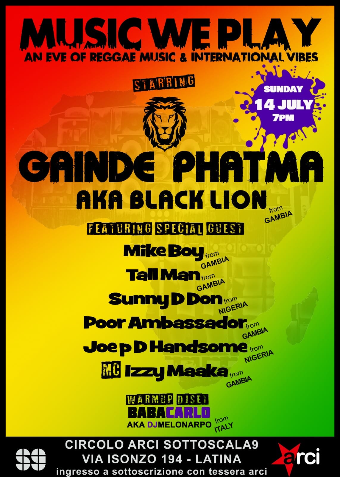 A Latina si è svolto un evento musicale all’insegna dell’intercultura: domenica 14 luglio al Sottoscala sono riuniti artisti africani per una serata di musica etnico-reggae. Sul palco arriva Gainde Phatma, conosciuto anche come Black Lion, artista gambiano che prosegue la gloriosa tradizione musicale del suo paese, dove reggae e ritmi africani si mescolano con l’ausilio dell’elettronica. Per l’occasione, Black Lion ha chiamato a raccolta altri artisti africani da tempo impegnati nella scena musicale underground italiana, come Sunny D Don e Joe p D Handsome dalla Nigeria insieme a Tall Man, Mike Boy, Achingy e Poor Ambassador, tutti dal Gambia. Sempre dal Gambia arriva Easy Maaka, l’MC della serata che presenterà e annuncerà gli artisti che si avvicenderanno sul palco, rendendo ancora più interattiva la festa in atto tra pubblico e musicisti, come vuole la tradizione reggae in pieno stile comunitario. Gainde Phatma scrive e compone i suoi pezzi su basi musicali prodotte in collaborazione con Raina della Villa Ada Posse: canzoni che raccontano la vita delle periferie africane ed europee tra sentimenti e rivalità in pieno stile raggaeton. I contenuti delle canzoni si ispirano anche alle esperienze di vita dei protagonisti che hanno vissuto l’esperienza dell’emigrazione sulla propria pelle come attraversare il deserto a piedi, la prigionia dei lager libici e il tragico viaggio in mare stipati in gommoni di fortuna fabbricati per trasportarne la metà. I nostri migliori auguri a Black Lion e ai suoi compagni di avventura.