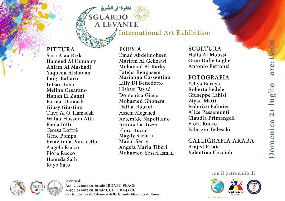Un evento unico che ha radici anche nel nostro territorio grazie all’associazione Ibdart-Peace di Cisterna di Latina: il 21 luglio 2019 alle ore 19.00 si terrà l’inaugurazione della Rassegna artistica internazionale “Sguardo a Levante”, presso la prestigiosa sede espositiva del Centro Culturale Islamico della Grande Moschea di Roma. La kermesse, di respiro internazionale, è organizzata infatti delle Associazioni culturali Ibdart Peace, Cultura4You e il Centro culturale Islamico di Roma con il patrocinio di importanti organizzazioni internazionali come la OEAEC-Belgique (Organisation Euro-arab pour l’échange culturel), la OEAEC TV Belgique, l’Unione delle Donne arabe – Delegazione egiziana e il Forum strategico interculturale Egitto-Italia. Tutto nasce dall’incontro di alcuni rappresentanti delle due associazioni, le poetesse Manal Serry e Antonella Rizzo con Valentina Cocciolo e Amjed Rifaie, esponenti di spicco nell’arte calligrafica araba. Il progetto viene subito condiviso dal Prof. Abdellah Redouane, Direttore della Grande Moschea di Roma che si conferma luogo ospitale e aperto a tutte le possibilità di incontro e di dialogo della Capitale. Saranno esposte opere di fotografia, scultura, pittura e componimenti poetici: il tema del Levante nell’immaginario artistico e personale degli artisti vuole rappresentare il flusso di corrispondenze culturali ed emotive con il mondo orientale in un’ottica di fratellanza e rispetto. La mostra avrà luogo dal 21 luglio al 27 luglio 2019 e si aprirà con una cerimonia di inaugurazione alla presenza di esponenti del mondo culturale, politico e religioso internazionale. Tutti gli artisti riceveranno un attestato di partecipazione e sono previsti dei riconoscimenti per meriti particolari. Verranno esposte le opere degli artisti: per la scultura Halla Al Moussi, Gino Dalle Lughe, Antonio Petronzi; per la calligrafia araba Amjed Rifaie, Valentina Cocciolo; per la pittura Sara Alaa Rizk, Hameed Al Humairy, Ahlam Al Mashadi, Yaqueen Alshadan, Luigi Ballarin, Intsar Boba, Melina Cesarano, Hanan El Zanni, Fatma Damash, Giusy Giustino, Tarik A.Q Hamadah, Wafaa Hussein Atta, Paola Iotti, Teresa Loffrè, Gene Pompa, Ermelinda Ponticello, Angela Rucco, Flora Rucco, Hameda Salh, Kayo Sato; per la fotografia Yehya Baraya, Roberta Fedele, Giuseppe Labisi, Ziyad Matti, Federico Palmieri, Alice Passamonti, Claudia Primangeli, Flora Rucco, Fabrizio Tedeschi; per la poesia Emad Abdelmohsen, Mariem Al Gehzawi, Mohamed Al Karky, Fateha Benqasem, Marianna Cossentino, Lilly Di Benedetto, Hisham Fayad, Domenica Giaco, Mohamed Ghonem, Dalila Houaui, Assem Meghahed, Artemide Napolitano, Antonella Rizzo, Flora Rucco, Magdy Sarhan, Manal Serry, Angela Maria Tiberi, Mohamed Yossef Ismail.