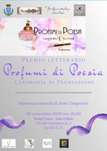 Domenica 22 settembre alle ore 18 si è svolta la seconda edizione del Premio “Profumi di Poesia”, presso le sale del prestigioso Hotel Enea. Quest’anno Fusibilia Libri, con la collaborazione della Profumeria Prioli, ha scelto Aprilia come sede della cerimonia di premiazione proprio per omaggiare la storica profumeria che quest’anno compie sessanta anni di attività. In rappresentanza del Comune di Aprilia era presente l’Assessore Elvis Martino e Alessandra Lombardi che si sono complimentati per lo spirito internazionale della manifestazione: i poeti premiati presenti alla manifestazione provenivano da ogni parte d’Italia con una rappresentanza da Palma di Maiorca. La Giuria, presieduta da Antonio Veneziani, esponente della storica scuola romana di poesia, era composta da Ida Di Ianni, Anita Napolitano, Franca Palmieri, Antonio Sacco e Maurizio Valtieri. Oltre ai primi tre classificati di ogni sezione e alle segnalazioni di merito sono stati conferiti da Fusibilia, la casa editrice sponsor del Premio, due riconoscimenti: alla poetessa Terry Olivi per la sua poetica che incarna in pieno lo spirito del premio e a Nicolò D’Ignazio, giovane talento poetico apriliano. La Casa profumiera che quest’anno ha sponsorizzato il Premio è Profumitalia, leader nella creazione di profumi di nicchia che si ispirano in gran parte ai paesaggi pontini, essenze che ricordano la brezza marina dei promontori e l’entroterra antico del territorio. Giusy Prioli ha introdotto gli ospiti nei segreti di ogni prezioso flacone che è stato consegnato ai vincitori di ogni sezione. A consegnare i premi, oltre a Dona Amati di Fusibilia, i giurati presenti e le autorità comunali erano presenti Manal Serry dell’associazione Ibdart Peace e il diplomatico Odeh Amarneh, Consigliere culturale dell’Ambasciata di Palestina. Irene Tempestini, giovane chitarrista, ha introdotto la manifestazione con un brano di musica classica. Una giornata di grande cultura e piacevolezza confermata dai riscontri dei partecipanti. Si lavora già alla terza edizione, ed è una risorsa per il nostro territorio.