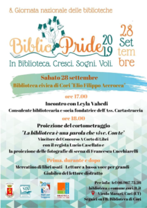 Anche quest’anno si festeggiano le biblioteche con l’ottava edizione del “Bibliopride 2019. In biblioteca. Cresci. Sogni. Voli.” giornata nazionale delle biblioteche promossa dall’AIB e volta a sensibilizzare la cittadinanza sull’importanza del sistema bibliotecario nazionale attraverso la realizzazione di eventi, laboratori e percorsi di lettura in centinaia di biblioteche italiane. Per la biblioteca comunale di Cori “Elio Filippo Accrocca” il Bibliopride è diventato ormai un appuntamento fisso, grazie alla rinnovata adesione dell’Associazione culturale Arcadia e del Comune di Cori. Un’occasione importante per festeggiare e condividere la bellezza del vivere la biblioteca insieme alla comunità, e affrontare temi cari alle biblioteche con esperti del settore con cui riflettere e confrontarsi. Sabato 28 Settembre, dalle ore 17:00, l’Istituto Cultuale di Palazzo Prosperi Buzi, in vicolo Macari, ospiterà Leyla Vahedi consulente bibliotecaria, autrice del libro “Leggere prima di leggere. Albi illustrati e libri app in età prescolare”, e socia fondatrice dell’associazione Cartastraccia, realtà romana che contagia con la sua effervescenza il panorama delle biblioteche pubbliche del Lazio. A seguire la proiezione del cortometraggio “La biblioteca è una parola che vive. Con te”, vincitore del concorso internazionale “A corto di libri” – categoria “Soggetto”, girato nella biblioteca di Cori da Lucio Casellato, che racconterà quest’esperienza di dialogo cinema-biblioteca. Verranno proiettate anche le fotografie di scena realizzate da Francesca Cucchiarelli che ha seguito e documentato, passo passo, le riprese. Ad animare il pomeriggio e la serata, un clima di festa e tante attività: mercatino di libri, letture a bassa voce per i grandi, Giubileo del lettore distratto (possibilità per i lettori “distratti” di riconsegnare libri con prestito scaduto da tempo, riconciliandosi con la biblioteca) e … un brindisi&duepizzette per chiudere in bellezza. Musicisti, cantanti, pittori, poeti o cantastorie avranno a disposizione un angolo performance.