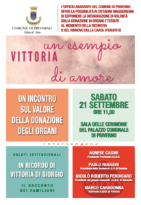 Il 21 settembre, presso la Sala delle Cerimonie del Palazzo Comunale, alle ore 11.00, il Comune di Priverno organizza un incontro sul valore della donazione degli organi, che sarà anche una gradita occasione per ricordare Vittoria Di Giorgio, una nostra concittadina scomparsa da qualche anno, della quale sono stati donati gli organi che hanno consentito ad altre persone di vivere. Laddove il trapianto di organi rappresenta un’efficace terapia per alcune gravi malattie e l’unica soluzione terapeutica per alcune patologie non altrimenti curabili, la donazione di organi e di tessuti rappresenta un atto di solidarietà verso il prossimo, un segno di grande civiltà e rispetto per la vita. Sul tema interverranno il Presidente Provinciale A.I.D.O Agnese Casini, il Presidente della Sezione A.I.D.O di Sonnino Paolo Ruggeri, il Presidente del Gruppo comunale A.I.D.O di Sabaudia Nicolò Roberto Perdicaro e il Referente A.I.D.O di Priverno Marco Caradonna.