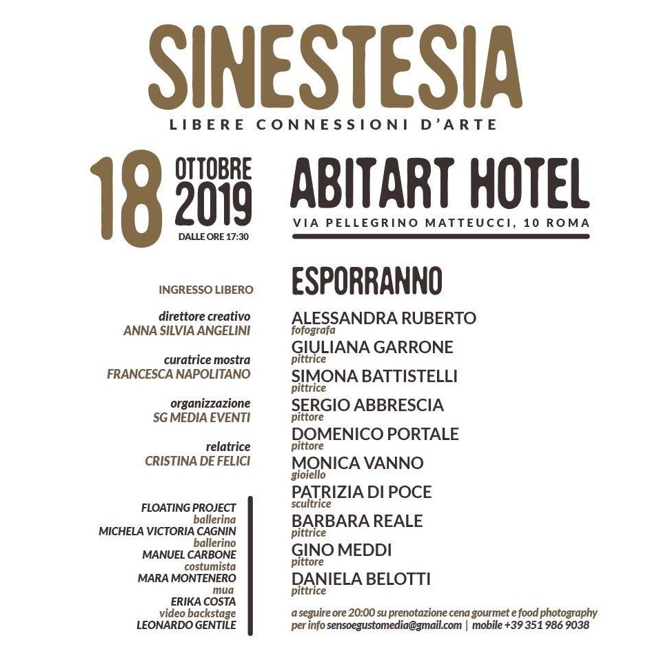 In occasione dell’anteprima del progetto fotografico “Floating” di Alessandra Ruberto prende vita la mostra d’Arte Contemporanea “Sinestesia”. Venerdì 18 Ottobre presso le splendide sale dell’Abitart Hotel in via Pellegrino Matteucci 10 a Roma, si terrà il vernissage della mostra, organizzata dalla SG Media Agency con la Direzione Creativa e comunicazione stampa di Anna Silvia Angelini. Gli artisti che esporranno sono Alessandra Ruberto, Giuliana Garrone, Simona Battistelli, Sergio Abbrescia, Domenico Portale, Monica Vanno, Patrizia di Poce, Barbara Reale, Gino Meddi e Daniela Belotti. La fotografa Alessandra Ruberto afferma: “Floating Project è un’elegante esplorazione del corpo umano attraverso il suo movimento; quello a cui sono interessata è la bellezza plastica nella sua accezione di eleganza, attraverso la grazia, insita nel linguaggio della danza. Vorrei tentare di evocare suggestioni cogliendo i ballerini nella loro teatrale assenza di peso e nel loro senso quasi drammatico di fuga”. Floating Project è inserito all’interno di una mostra collettiva dal nome di Sinestesia ovvero attraverso le libere connessioni d’arte si attivano tutti quei sensi che espandono le nostre emozioni e percezioni. Presenta l’evento Cristina De Felici, con la partecipazione del ballerino delle dive Simone Ripa e l’attrice Sissi Martina Palladini. Dopo la mostra l’evento Sinestesia continuerà espandendo le percezioni del gusto: con una cena gourmet realizzata dallo Chef Francesco Bonanni e dal Food Photographer Luca Corsetti.