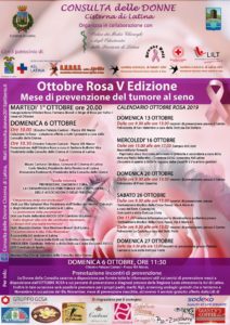 Un mese di iniziative, incontri ed approfondimenti in nome della prevenzione ed informazione sul tumore al seno, e non solo. Torna l’’Ottobre Rosa’ a Cisterna, quest’anno con un calendario ancora più ricco di appuntamenti. Organizzato dalla Consulta delle Donne in collaborazione con la Pro Loco, il Comune di Cisterna e con l’Ordine dei Medici Chirurghi e degli Odontoiatri della Provincia di Latina, la manifestazione – giunta alla sua quinta edizione – verrà inaugurata il 1°ottobre alle ore 20 con la tradizionale accensione in rosa della Dea Feronia in Piazza XIX Marzo. Con il patrocinio della Provincia di Latina, della ASL, dell’ A.N.D.O.S. di Aprilia, Velletri e Latina, della LILT, della Croce Rossa e Breast Unit, l’Ottobre Rosa 2019 sarà all’insegna del coinvolgimento a tutto tondo, partendo dalla volontà della Consulta di costruire una rete territoriale utile per tutta la cittadinanza, comprese le fasce più giovani, a partire dal diretto interessamento di medici ed associazioni specializzate. Grande attenzione per l’appuntamento del 6 ottobre, dalle ore 10 presso Palazzo Caetani. Si inizierà con la colazione offerta dalla Consulta e la presentazione nel dettaglio dell’Ottobre Rosa. Seguiranno poi i saluti delle istituzioni e l’avvio della tavola rotonda che affronterà i vari step della malattia, dalla prevenzione alla diagnosi fino alla cura, coinvolgendo gli attori essenziali per una efficiente rete territoriale, che daranno il loro supporto ed indirizzo e racconteranno le proprie esperienza. Durante quella mattinata sarà possibile prenotare in loco le visite di screening e prevenzione. Inoltre, novità di quest’anno, sarà possibile per specifiche esigenze effettuare ecografie e prenotare mammografie. Con un occhio anche alla prevenzione maschile, altra novità assoluta è rappresentata dalla possibilità di prenotare visite urologiche per gli uomini. E siccome non è mai troppo presto per imparare a fare prevenzione, la Consulta in collaborazione con la ASL Latina ha organizzato anche un’iniziativa dedicata esclusivamente ai ragazzi e ai loro genitori sul tema del Papilloma Virus, prevista per il 16 ottobre presso il Liceo Ramadù. “La prevenzione, l’informazione e quindi la diagnosi precoce – commenta il Sindaco, Mauro Carturan – restano per ora le cure più efficaci contro il tumore al seno. Per questo l’iniziativa portata avanti sul nostro territorio comunale dalla Consulta delle Donne di Cisterna è preziosa e va sostenuta. Mi auguro che le nostre concittadine partecipino a tutti gli eventi in programma e che contribuiscano alla diffusione del messaggio di sensibilizzazione”. “Possiamo dire con soddisfazione di aver centrato l’obiettivo che ci eravamo prefisse già dallo scorso anno, ovvero quello di farci promotrici e costituire una vera e propria rete territoriale utile, per le donne e non solo, alla prevenzione ed informazione – afferma Alessandra Pontecorvi, Presidente della Consulta delle Donne di Cisterna -. L’Ottobre Rosa quest’anno è un intero mese a servizio della città, e ciò non sarebbe stato possibile senza il supporto organizzativo dell’Ordine dei Medici e dalla ASL, che ringrazio sin da subito. Così come ringrazio sentitamente tutti i medici che hanno dato disponibilità per effettuare le visite nel corso del mese e che prestano gratuitamente il loro servizio. Queste collaborazioni ci hanno permesso di rendere più completo e differenziato il percorso di visite e screening che offriamo alle donne. E anche se l’Ottobre Rosa nasce come evento di sensibilizzazione alla prevenzione al tumore al seno, quest’anno abbiamo voluto estendere il concetto di prevenzione anche agli uomini, con la possibilità di prenotare visite urologiche, ed ai ragazzi con una giornata sul Papilloma Virus. Insomma sarà un mese dedicato proprio a tutti, per questo invito la cittadinanza a partecipare numerosa”.