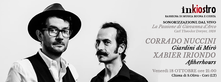 Venerdì 18 ottobre, presso la Chiesa S. Oliva di Cori, Corrado Nuccini e Xabier Iriondo presenteranno il cine-concerto ‘La passione di Giovanna D’Arco’ (1928) all’interno di ‘InKiostro – Rassegna di musica e scrittura’, che per l’occasione tornerà ad essere Rassegna di musica buona e giusta. Per la prima volta la Chiesa S. Oliva diverrà una sala cinematografica con la proiezione del capolavoro del cinema muto ‘La passione di Giovanna D’Arco’, che Corrado Nuccini e Xabier Iriondo sonorizzeranno dal vivo in una complessa revisione musicale: una rappresentazione intensa e drammatica che alterna melodia, silenzi e rumore. Durante ‘InKiostro – Rassegna di Musica e Scrittura’ sono saliti sull’altare della Chiesa di Sant’Oliva a Cori Dellera (Afterhours), Emidio Clementi (Massimo Volume) e Corrado Nuccini (Giardini di Mirò), Cristiano Godano (Marlene Kuntz), Paolo Benvegnù, Guido Maria Grillo, Giulio Casale, Emanuele Colandrea (Eva Mon Amour/Cappello a Cilindro) e Rival Karma (dagli UK), che hanno registrato sempre il tutto esaurito. La rassegna è nata con lo scopo di valorizzare esperienze musicali nazionali e internazionali di qualità, contraddistinte da un significativo tasso di sperimentazione e una forte autorialità. La proposta artistica è resa più affascinante dalle location particolarmente suggestive che ne potenziano l’impatto emotivo; protagonista degli appuntamenti della rassegna non è solo la musica in quanto tale, ma il connubio creativo con i preziosi spazi (teatri, chiese, palazzetti storici…) del territorio e la sacralità della stessa. Un valore aggiunto della rassegna è senza dubbio la Chiesa di Sant’Oliva. Il complesso è stato costruito nel XII secolo sui resti di un tempio romano. Nella volta è presente un bellissimo ciclo pittorico risalente al XVI secolo con immagini dell’Antico e Nuovo Testamento e del Giudizio Universale. Prima e dopo i concerti l’azienda agricola “Le Quattro Vasche” e il Ristorante Caffè del Cardinale” offriranno la possibilità di degustare i loro prodotti presso Palazzetto Luciani (antistante la chiesa di Sant’Oliva).