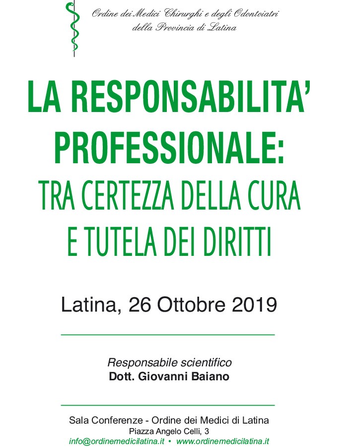 Si terrà sabato 26 Ottobre dalle ore 11.00 alle ore 15.30, presso la sala conferenze dell’Ordine dei Medici, in Piazza Angelo Celli n. 3 a Latina, il convegno La Responsabilità Professionale: tra certezza della cura e tutela dei diritti organizzato dall’Ordine dei Medici Chirurghi e degli Odontoiatri della provincia. L’incontro è rivolto, oltre che ai medici iscritti all’Ordine, anche agli studenti del V e del VI anno del Corso di Laurea di Medicina e Chirurgia de “La Sapienza Roma”. Nel corso del dibattito saranno affrontati diversi aspetti del ruolo del medico nella società moderna, quali le responsabilità di fronte al Codice Deontologico e alle leggi dello Stato ma, si analizzerà anche il comportamento del medico sempre più condizionato dalla necessità di tutelarsi per evitare possibili procedimenti giudiziari e di rivalsa. I lavori si apriranno con i saluti del presidente OMCeO di Latina Giovanni Maria Righetti e proseguiranno con la il dottor Giovanni Baiano, responsabile scientifico, che presenterà il convegno. Fra i relatori Maria Giovanna Vicarelli, Professore di Sociologia presso la Facoltà di Economia Giorgio Fuà, dell’Università Politecnica delle Marche. Gianfranco Iadecola, avvocato nel settore penale esperto della Consulta di deontologia costituita presso la FNOMCeO. Claudio Modini, Manager responsabile dei piani di Emergenza interna in risposta alle Maxiemergenze di delegazioni, capi di stato e personalità in visita in Italia. Raffaella Rinaldi Medico chirurgo e psichiatra forense. E’ Professore Aggregato di Medicina legale e delle Assicurazioni presso il Dipartimento di Medicina Legale. L’evento sarà trasmesso in diretta streaming su www.ordinemedicilatina.it