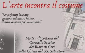 Si chiama L’ARTE INCONTRA IL COSTUME la mostra che sarà inaugurata oggi alle 16.30 (visitabile fino alle 19) e resterà aperta anche domenica (ore 10 – 19) nella chiesa del SS Salvatore a Cori. Ben 30 costumi del Carosello Storico dei Rioni saranno esposti nei due giorni. Saranno tutti costumi indossati da priore, dal 1998 al 2018. Dunque, venti anni di storia del Carosello Storico in mostra e, per di più, in un luogo particolare: l’antica chiesa del SS Salvatore, risalente al XVI secolo – situata nel cuore del centro storico, adiacente gli splendidi resti del tempio dei Dioscuri (I sec a.C.) e l’area di quello che fu il foro dell’antica Cora -, che sarà eccezionalmente aperta per questa occasione. Si tratterà di un evento per così dire corale, organizzato dall’Ente Carosello Storico dei Rioni ma frutto del contributo della comunità corese, così legata alla tradizione del Carosello: i preziosi abiti protagonisti della mostra sono infatti tutti di proprietà, ciascuno del valore di diverse migliaia di euro, e saranno le priore che li hanno fatti cucire e che li hanno indossati a portarli in chiesa e a metterli a disposizione per l’allestimento, che sarà curato da Luana Milita. L’ARTE INCONTRA IL COSTUME proprio perché l’arte, cioè la chiesa con il suo patrimonio artistico, si apre per accogliere la rappresentazione di un’epoca. “L’idea della mostra – dicono gli organizzatori – nasce dalla volontà di valorizzare il patrimonio di costumi delle priore e, nel contempo, un patrimonio artistico e culturale quale è la chiesa del SS Salvatore. Dunque, il tessuto si fonderà con l’architettura: elementi colorati, preziosi e ben definiti come i costumi troveranno la loro collocazione in uno spazio altrettanto prezioso, ma bisognoso di intervento per rispristinarne a pieno l’antica bellezza”. La mostra sarà infatti occasione per raccogliere fondi per il restauro e la conservazione del patrimonio della chiesa del SS Salvatore e chi vorrà potrà fare una donazione. Lo slogan alla base dell’iniziativa recita: “Se vogliamo lasciare qualcosa nel nostro futuro, diamo un aiuto per conservarlo”.