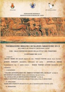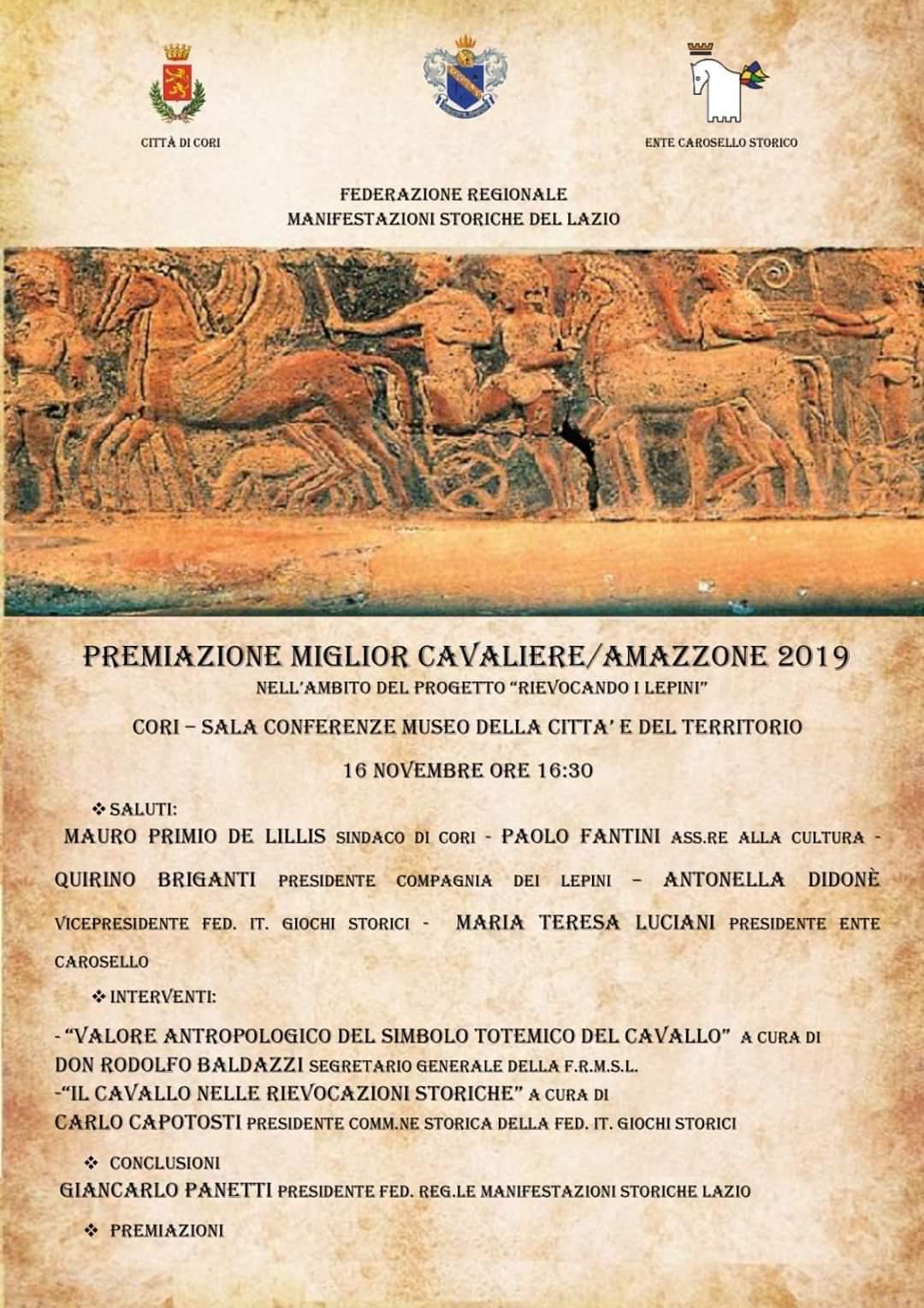 Si terrà sabato 16 novembre alle ore 16.30, nella sala conferenze del Museo della Città e del Territorio di Cori, la Premiazione del Miglior Cavaliere/Amazzone 2019. L’iniziativa, alla sua prima edizione, è stata ideata dalla Federazione Regionale Manifestazioni Storiche del Lazio, che ha scelto la Città d’Arte lepina, patria del Carosello Storico dei Rioni, per ospitare l’evento. La F.R.M.S.L., che raccoglie 20 associazioni di tutte le provincie del Lazio, è nata tre anni fa con lo scopo di valorizzare e promuovere le rievocazioni storiche laziali, tutelando gli aspetti culturali e spettacolari legati al passato delle città e delle associazioni aderenti. Nel corso della cerimonia di sabato, nell’ambito del progetto ‘Rievocando i Lepini’, saranno premiati coloro che si sono classificati ai primi tre posti di una graduatoria stilata selezionando e valutando decine di cavalieri e amazzoni che nel 2019 hanno partecipato a manifestazioni aderenti alla Federazione caratterizzate da giostre cavalleresche. I saluti istituzionali saranno portati dal sindaco di Cori, Mauro Primio De Lillis, dall’assessore alla Cultura, Paolo Fantini, dal presidente della Compagnia dei Lepini, Quirino Briganti, dalla vicepresidente della Federazione Italiana Giochi Storici, Antonella Didone, e dalla presidente dell’Ente Carosello, Maria Teresa Luciani. Seguiranno gli interventi di Don Rodolfo Baldazzi, segretario generale della F.R.M.S.L., sul ‘Valore antropologico del simbolo totemico del cavallo’ e di Carlo Capotosti, presidente della commissione storica della Federazione Italiana Giochi Storici, su ‘Il cavallo nelle rievocazioni storiche’. Le conclusioni saranno affidate al presidente della F.R.M.S.L., Giancarlo Panetti. Sarà quindi il momento delle premiazioni: riceverà il primo premio Massimiliano Lutero, di Sezze; il secondo posto sarà per Marco Toselli, di Cori; al terzo posto, a pari merito, Enrico Berardi, Giordano Riganeli, Massimo Frattali, Luigi Paolo Zampini, Mauro Massoli, Vittorio Colagiovanni.