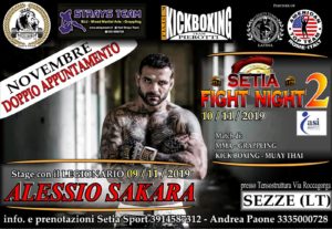 L’evento, organizzato dall’Asd Setia Sport e dall’Asd Strays, si intitolerà “Setia fight night 2” e consentirà anche ai meno esperti e a tutti gli appassionati di arti marziali e sport di combattimento di partecipare a un corso di formazione unico nel suo genere, al fianco del famoso lottatore romano che attualmente combatte nella federazione statunitense Bellator MMA.