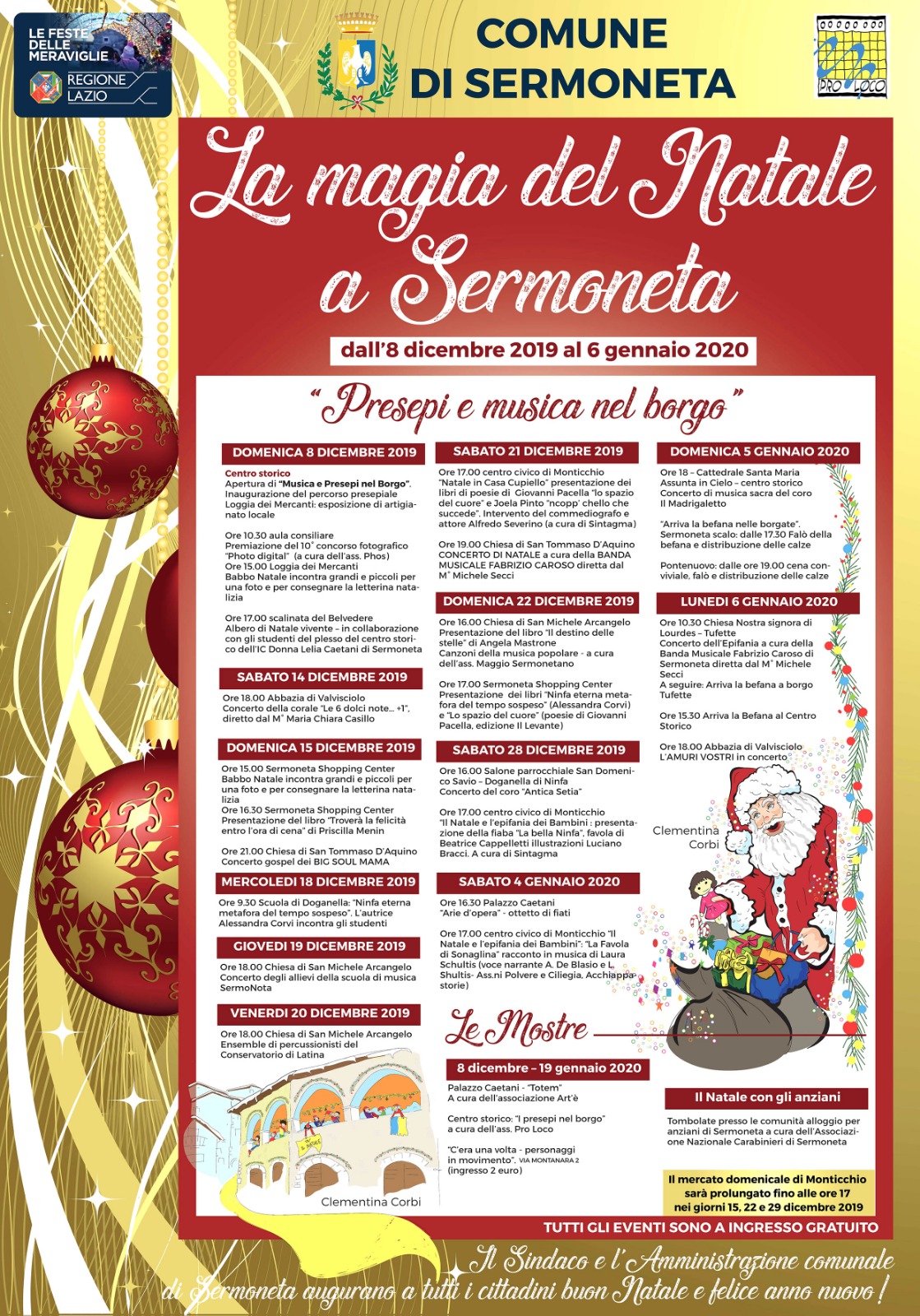 La magia del Natale arriva a Sermoneta. Tante le iniziative predisposte dall’amministrazione comunale dall’8 dicembre 2019 al 6 gennaio 2020, nell’ambito del progetto “Presepi e musica nel borgo” finanziato dalla regione Lazio – le feste delle meraviglie. Il centro storico di Sermoneta si trasforma in un grande spazio espositivo natalizio a cielo aperto, con decine di presepi realizzati dagli artigiani locali allestiti in ogni angolo del paese, nelle chiese, tra le abitazioni e sotto le nicchie, tutti da scoprire. L’illuminazione artistica e numerosi eventi musicali, sia nel centro storico che nella pianura arricchiranno il calendario delle manifestazioni, tutte a ingresso gratuito. Si parte domenica 8 dicembre con l’inaugurazione dei presepi, la premiazione del concorso fotografico Photo Digital e l’arrivo di babbo Natale alla Loggia dei Mercanti; alle 17, l’albero di Natale vivente sulla scalinata del Belvedere realizzato dagli studenti del plesso del centro storico dell’istituto comprensivo Donna Lelia Caetani di Sermoneta. Sabato 14 dicembre all’abbazia di Valvisciolo concerto di Natale a cura della corale “Le 6 dolci note… +1” diretta dal M° Maria Chiara Casillo. Domenica 15 dicembre al Centro Commerciale Sermoneta Shopping center Babbo Natale incontra grandi e piccoli per una foto e per consegnare la letterina natalizia. A seguire la presentazione del libro “Troverà la felicità entro l’ora di cena” di Priscilla Menin. Alle ore 20.30 alla Chiesa di San Tommaso D’Aquino concerto gospel dei Big Soul Mama. Giovedì 19 dicembre alle ore 18 alla chiesa di San Michele Arcangelo concerto degli allievi della scuola di musica Sermonota mentre il venerdì 20, sempre alle 18, ensemble di percussionisti del Conservatorio di Latina. Sabato 21 dicembre alle ore 19.00 alla Chiesa di San Tommaso D’Aquino concerto di Natale a cura della banda musicale Fabrizio Caroso diretta dal M° Michele Secci. Domenica 22 si torna alla chiesa di San Michele Arcangelo con la presentazione del libro “Il destino delle stelle” di Angela Mastrone e le canzoni della musica popolare a cura dell’associazione Maggio Sermonetano. Il 28 dicembre alle 16 al salone parrocchiale San Domenico Savio di Doganella di Ninfa concerto del coro “Antica Setia”. Altri appuntamenti nel mese di gennaio: sabato 4 alle 17 a palazzo Caetani l’ottetto di fiati eseguirà le “Arie d’Opera”, il 5 gennaio alla cattedrale Santa Maria Assunta in Cielo concerto di musica sacra del coro Il Madrigaletto, mentre nel tardo pomeriggio arriverà la befana nelle borgate di Sermoneta Scalo e Pontenuovo. Il 6 gennaio alle 10.30 presso la chiesa Nostra signora di Lourdes in località Tufette Concerto dell’Epifania a cura della Banda Musicale Fabrizio Caroso di Sermoneta. A seguire arriva la befana. Nel pomeriggio la befana arriverà al centro storico, mentre alle 18.30 all’abbazia di Valvisciolo concerto de L’Amuri Vostri. Dall’8 dicembre al 19 gennaio, inoltre, è stata allestita una mostra d’arte presso Palazzo Caetani. L’Associazione Nazionale Carabinieri di Sermoneta organizzerà tombolate presso le comunità alloggio per anziani di Sermoneta.