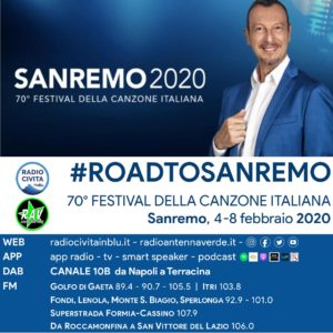 Dal 4 all’8 febbraio Radio Civita InBlu e RAV Radio Antenna Verde partiranno per Road to Sanremo 2020, il progetto radio, tv, web e social che seguirà il 70° Festival della Canzone Italiana di Sanremo. Interviste, curiosità e dirette dall’Ariston, con sei inviati dal Golfo degli Aurunci per seguire la kermesse canora più importante d’Italia, con inviati accreditati in Sala Stampa e on the road per le strade di Sanremo. Gli editori di RCI e RAV affermano: “Vogliamo raccontare il Festival cercando di creare un ponte tra Sanremo e il Golfo degli Aurunci. Siamo contenti dell’opportunità di essere presenti a un evento così importante a livello radiofonico e comunicativo. Tutto ciò è reso possibile grazie ai nostri sponsor e partner che ringraziamo di cuore”. Radio Civita InBlu è in radio fm, app, social e web su www.radiocivitainblu.it. RAV Radio Antenna Verde è in radio fm, tv, app, social e web su www.radioantennaverde.it, in DAB canale 10B da Napoli a Terracina e sul nuovo canale televisivo RAV TV. Linea diretta WhatsApp al 348.8881447 e 349.2520492.