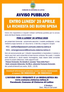 Scadrà lunedì prossimo, 20 aprile, il termine per la presentazione delle domande per la concessione dei Buoni Spesa a Cisterna di Latina.