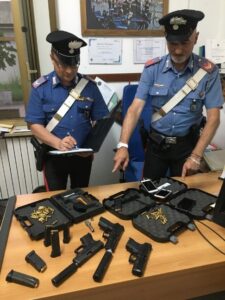 Nella serata del 14 giugno, a Latina, in Viale Europa, militari della sezione radiomobile della compagnia carabinieri di Latina hanno tratto in arresto Carocci Stefano, 38enne di Latina, e Finocchiaro Pietro, 40enne di Latina, sorpresi a trasportare in automobile tre pistole cariche, di cui due munite di silenziatore e una di esse con il colpo in canna.
