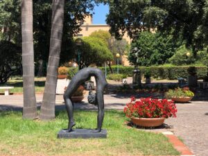 Le opere di Francesca Tulli esposte in questa occasione a Latina sono esemplificative della complessa poetica dell’artista che, nella scultura, si indirizza verso una figurazione che affronta instabili equilibri dinamici. Le figure realizzate in bronzo, resina o terracotta, talvolta deformate o “mutate” cercano una stabilità più mentale che fisica mentre dialogano e si integrano con elementi e materiali diversi fra loro, mentre le teste tra il classico e il futuribile, hanno volti sempre privi di sguardo, come appartenenti ad esseri arrivati da spazi siderali, assorti in un profondo dialogo con sé stessi. L’opera “DOPPIO APPOGGIO“ in mostra è una variante della scultura che è collocata al centro della fontana di Piazza dei Navigatori sul lungomare di Foce Verde a Latina.