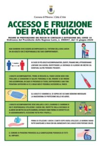 L’apertura avverrà nel rispetto di tutte le misure di sicurezza anti-contagio. Ogni bambino dovrà essere accompagnato all’interno dell’area giochi da un adulto che è responsabile dei suoi comportamenti, il quale, prima di recarsi al parco giochi dovrà controllare le condizioni di salute personali e del minore che accompagna. Qualora il bambino manifestasse sintomi quali tosse, raffreddore o una temperatura superiore ai 37,5 gradi non potrà accedere al parco.