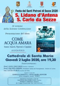 Organizzato da “Comitato festeggiamenti”, in collaborazione con l’Arcipretura della Cattedrale e il Centro Studio San Carlo da Sezze e il patrocinio del Comune di Sezze, al termine della funzione religiosa, si terrà la prima presentazione pubblica del libro “Come acqua amara”, di Lucia Fusco, edito da Sintagma.