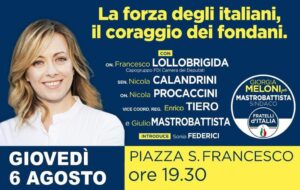 Un doppio dibattito pubblico, in piazza, alla presenza di alcuni dei massimi esponenti locali e nazionali del partito e dei candidati sindaco. E’ questo l’appuntamento promosso da Fratelli d’Italia per oggi a Fondi (ore 19,30) e Terracina (ore 21,30). Due momenti per ribadire il forte legame del partito con il territorio, affrontando temi legati alle prospettive di sviluppo e alle attività individuate per affrontare le criticità dell’attuale situazione economica e sociale, anche in chiave nazionale. Sarà in particolare l’on. Francesco Lollobrigida, capogruppo di FDI alla Camera dei Deputati, a toccare i temi di carattere nazionale e sottolineare le posizioni fortemente critiche nei confronti del governo e della maggioranza che lo sostiene, che Giorgia Meloni e tutti gli esponenti di FDI stanno portando avanti in tutte le sedi e le occasioni di confronto politico.