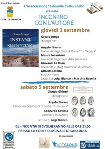 Il primo evento ha come ospite graditissimo Orazio Longo: scrittore, docente di Educazione musicale e maestro di pianoforte, giornalista, pianista ed esperto di problemi socio-politici, oltre, alla pubblicazione di tre CD musicali. Longo è autore di “Neanche a dirlo era bellissima – Corti su carta”; “Il mare della speranza per soprano e orchestra”; “La conquista. In bilico sulla vetta senza nome”; “Il papa mancato. Mariano Rampolla del Tindaro, il cardinale siciliano che sfidò i Savoia e l’imperatore d’Austria”. In particolare, al centro della serata sarà il suo “Instant Shooting: libro di brevi racconti con contrappunto fotografico”.