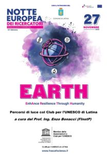 Durante i vari incontri, divisi per fasce orarie, si parlerà di scienza, una scienza accessibile e divertente, in grado di generare consapevolezza su quanto sta accadendo al nostro pianeta. Saranno analizzati gli strumenti che abbiamo per combattere, o meglio resiliere, al cambiamento climatico e all’emergenza sanitaria che stiamo vivendo. Si porrà l’accento sulle Smart Cities, su salute, benessere, energia, ambiente, arte e studi umanistici. Di energia e luce parlerà il Club per l’Unesco di Latina intorno alle ore 20.00 di Venerdì 27 Novembre. Il titolo dell’incontro è Percorsi di luce col Club per l’UNESCO di Latina, relatore per il Club il Prof. Enzo Bonacci insegnante di Matematica e Fisica, membro d’importanti associazioni scientifiche italiane ed internazionali ha all’attivo diverse pubblicazioni e riconoscimenti professionali e scientifici. La relazione sarà disponibile alle ore 20.00 sul link https://www.youtube.com/user/FrascatiScienza.