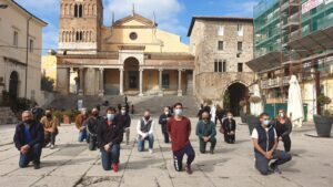 Presente anche l’europarlamentare di Fratelli d’Italia, Nicola Procaccini, che nei giorni scorsi aveva dato vita ad un analoga, clamorosa iniziativa all’interno del Parlamento europeo, quando si era inginocchiato per rendere omaggio a Samuel Paty, il professore francese che nelle ore precedenti era stato vittima di un brutale assassino per mano di un fanatico islamico solo per aver voluto insegnare la libertà di espressione ai suoi giovani studenti. Alle ore 11,30, in piazza municipio, i partecipanti alla manifestazione hanno compiuto il plateale gesto inginocchiandosi davanti la cattedrale di San Cesareo, luogo simbolo della storia e della tradizione religiosa della città di Terracina e non solo. Hanno così voluto dare un forte messaggio di sostegno a coloro che sono rimasti vittime del terrorismo islamico ma, più in generale, a chi si batte per la liberta di pensiero, di espressione e di opinione che sono alla base di ogni civile convivenza e del progresso umano, condannando, invece, chi, come il fanatismo islamico, si oppone a queste libertà fondamentali con la violenza e l’oscurantismo.