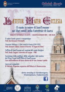 L’appuntamento “Lætetur Mater Ecclesia” prende il titolo dall’incipit dell’antifona del primo salmo dei primi vespri del patrono Sant’Erasmo (la cui festa era allora distinta da quella di San Marciano). Il manoscritto è inserito nel codice denominato L.C. M. III: illustrerà il libro corale dal punto di vista codicologico don Gennaro Petruccelli, direttore dell’archivio dell’arcidiocesi di Gaeta; sulla figura di Vincenzo Pontano interverrà Gennaro Tallini del Centro di Ricerca “Al Segno di Fileta”; la composizione e produzione a livello locale di un ufficio proprio in onore dei santi sarà esposta da Nicola Tangari dell’Università di Cassino e del PIMS.