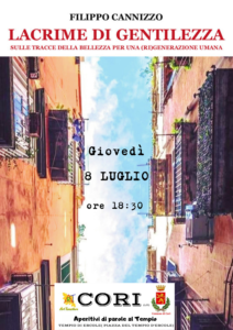 Giovedì 8 Luglio 2021, ore 18:30, a Cori, nella splendida cornice del Tempio di Ercole (Piazza Tempio d’Ercole), in occasione della manifestazione “Aperitivi di Parole al Tempio“, si terrà in anteprima assoluta la presentazione del libro del filosofo Filippo Cannizzo: “Lacrime di Gentilezza. Sulle tracce della bellezza per una (ri) generazione umana“.