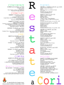 Si chiama ‘Restate a Cori’ il calendario delle iniziative e degli eventi culturali che si stanno svolgendo a Cori, con il patrocinio del Comune, per accompagnare coresi e non in questa estate appena iniziata. Ce n’è davvero per tutti i gusti e tutti i palati, visto che il programma si muove tra aperitivi letterari, concerti, mostre, conferenze, teatro, cinema, libri e il ritorno delle Giornate Fai.