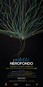 “Il ciclo Pastelli NEROFONDO di Angelo Bianchi ha visto la luce durante il periodo di clausura straordinaria dovuta alla pandemia che ha afflitto il pianeta tra il 2020 e il 2021. Al nero come metafora esistenziale della condizione dolorosa dell’intera umanità e dello stato critico della materia alchemica, l’artista contrappone il suo personale mondo fatto di colori primari, di figure primordiali, di segni asemici. Ne risulta una serie di quadri tra la scenografia e la grafica, che messi in infinite successioni possibili danno origine ad altrettante sequenze narrative. Da una di queste è nato il cortometraggio d’animazione dal titolo Pastelli NEROFONDO. Ciascuna delle tavole e lo stesso cortometraggio che da esse scaturisce finiscono col farsi veicolo di un messaggio di speranza, in perfetta armonia con il ciclo di rinascita alla base della tradizione mitica e fiabesca. Questa via lucis, disegnata da Bianchi su fondi neri, assume un valore simbolico ed esemplare; sembra suggerire a noi tutti un cammino da percorrere per uscire dal buio di una condizione di costrizione e sofferenza, passando dalla dimensione dell’incubo a quella del sogno”. Mauro Carrera