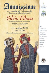 Domenica 11 luglio alle ore 19.00 nella chiesa dell’Annunziata a Maranola di Formia, si terrà l’Ammissione tra i candidati agli Ordini sacri del diaconato del presbiterato del seminarista Silvio Filosa. La celebrazione sarà presieduta dall’arcivescovo di Gaeta Luigi Vari e sarà trasmessa su Facebook Arcidiocesi di Gaeta e su Radio Civita InBlu.